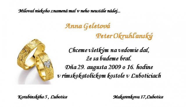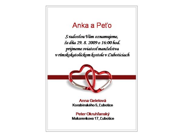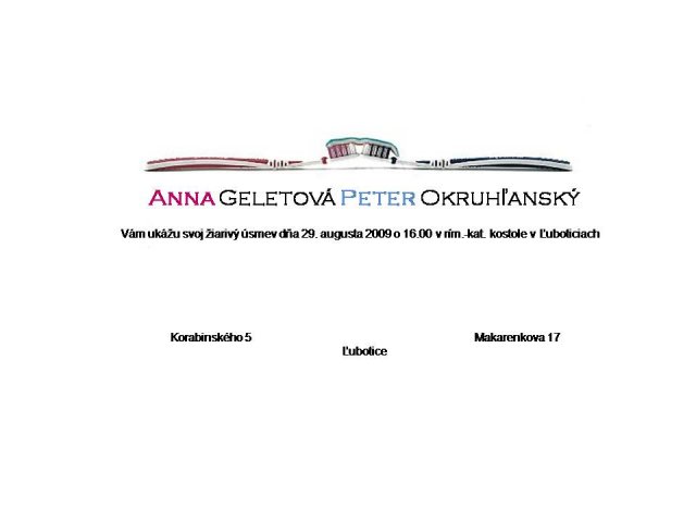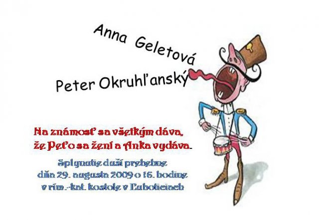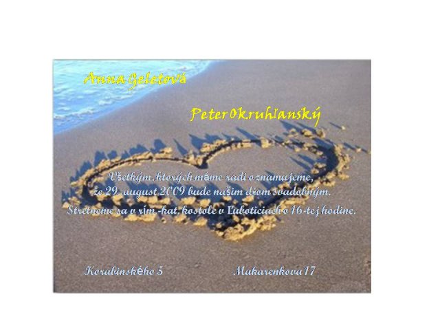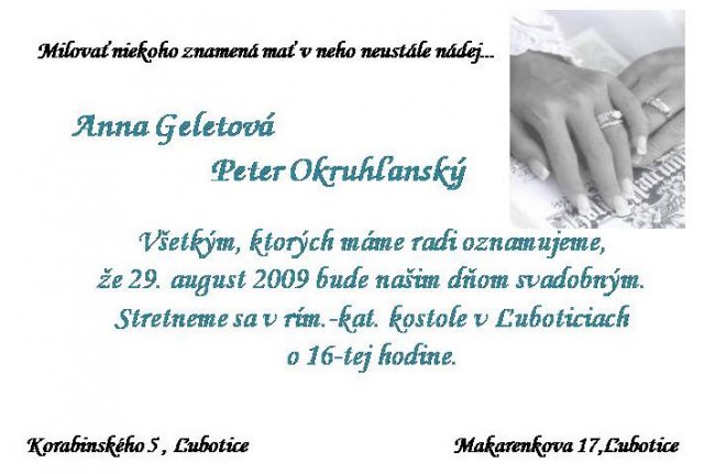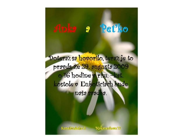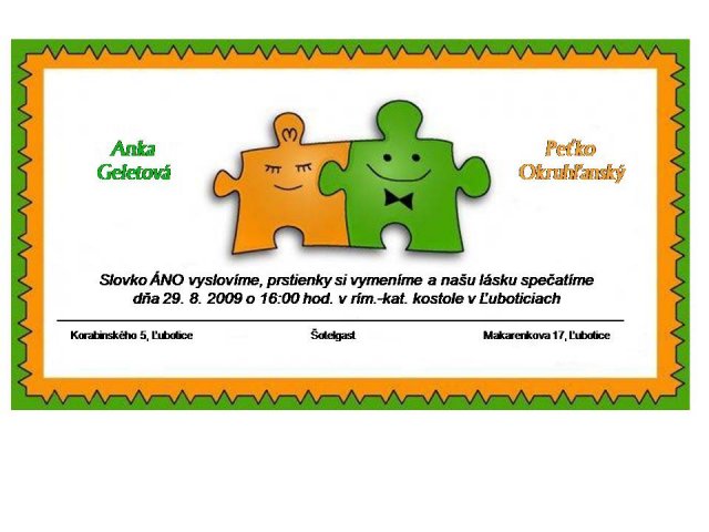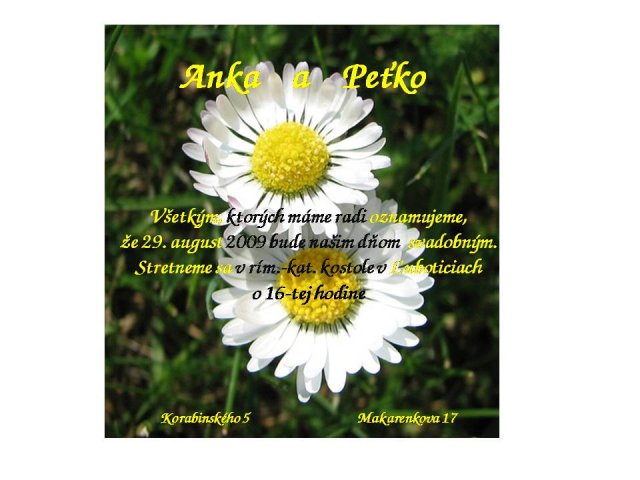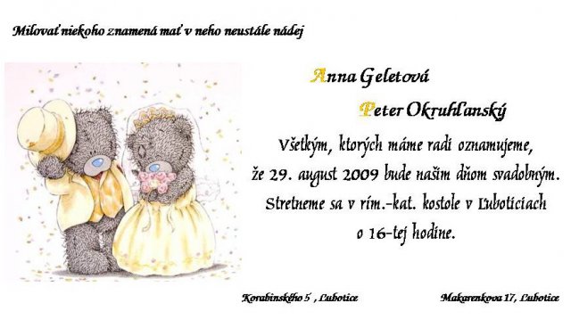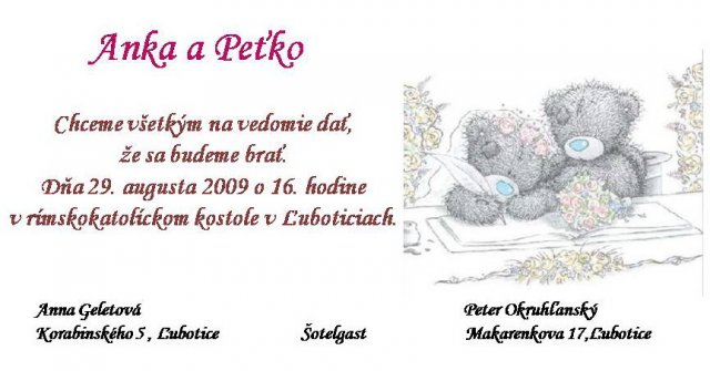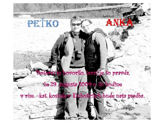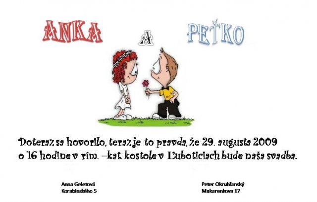 Anka a Peťko -Náš svadobný deň bude 29. august :))) veľmi sa tešíme, aj keď už teraz máme dosť stresov s vybavovaním potrebných vecí...No a toto sú začiatky a plány na náš deň "D" :-)