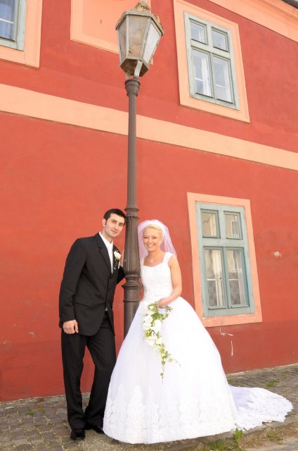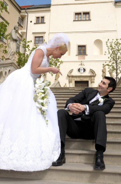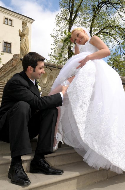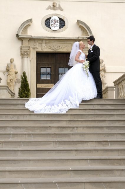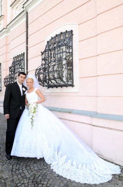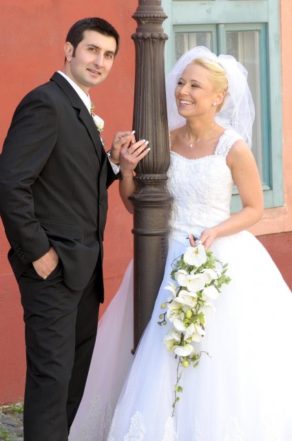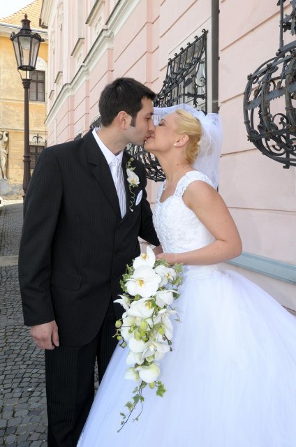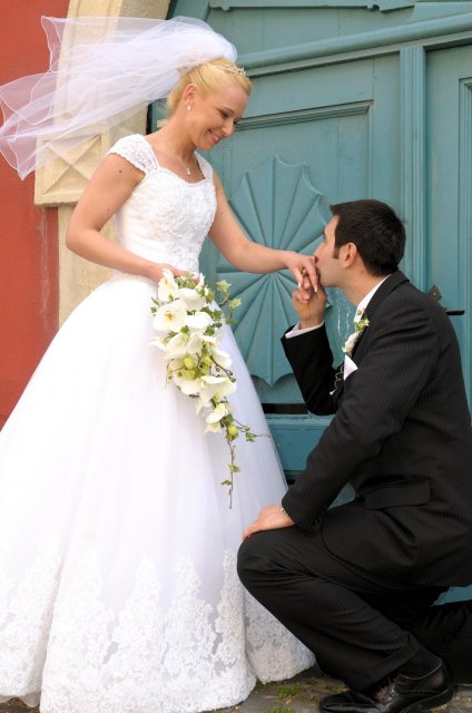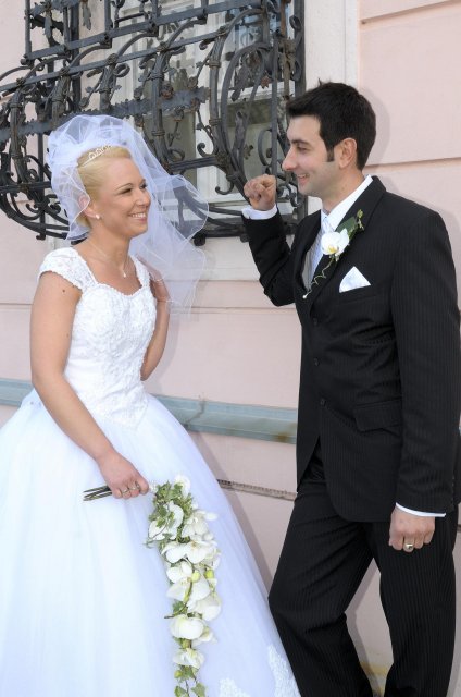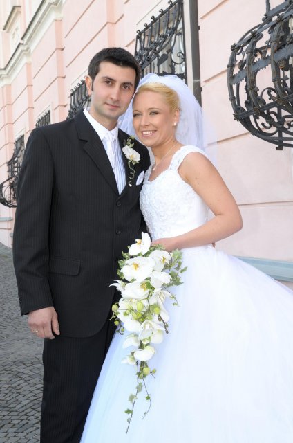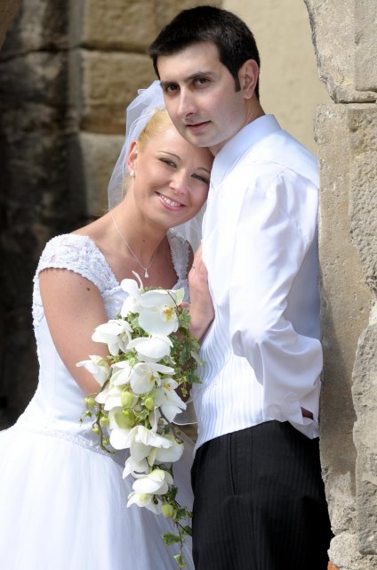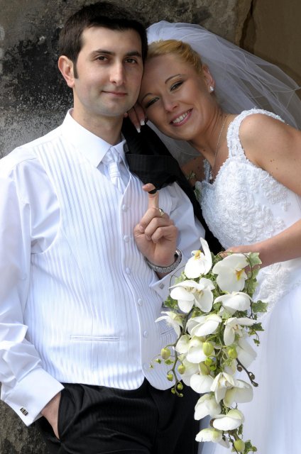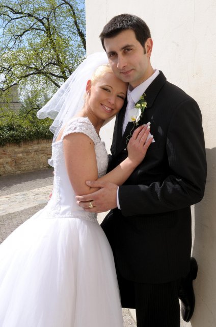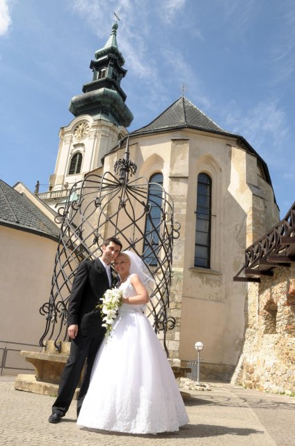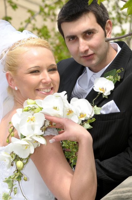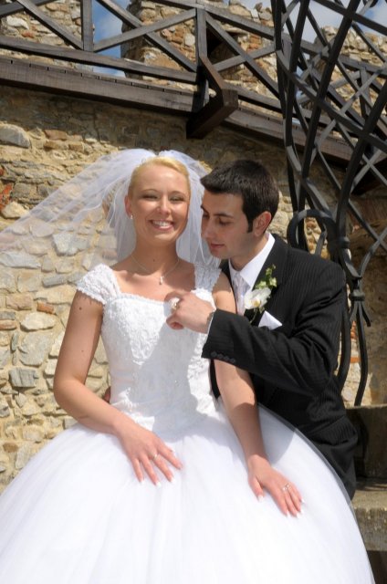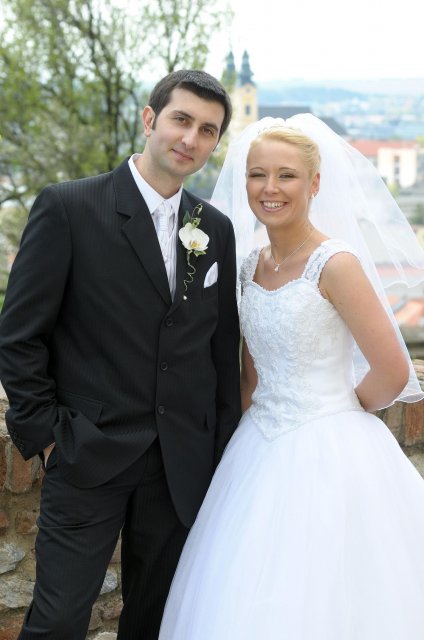Moj svadobný deň? Nevedela som si ho vobec predstavit, kedze sa predpoved pocasia obratila proti nam :( ... do piatku vecera som hľadala pozitívne myšlienky o tom co budem robit ked bude prsat, že moja 2 metrova vlečka ostane nepoužitá. Nakoniec som po dlhej modlitbe za pocasie bez dažda zaspala ako malé mača. Rano sa začínalo pokojne, moja tetuška Martuška, čo mi robila môj dokonalý účes prišla v dohodnutý čas k nám domov. Po učesaní k nám prišla moja drahá priateľka Mimi, ktorá sa postarala o perfektný make-up. Takto učesaná namejkapovaná som skočila do šiat za pomoci mojich zlatých priateliek a takto počkala na mladého zaťa, s ktorým sme už v našom svadobnom autíčku zašli do Nitry pod hrad nafotit zopar pamätných záberov... posudte sami ako sa podarili :o) ... vietor sa striedal s mrakmi, cez ktore sa obcas predralo slniecko .... nas den bol jedinecný, nezabudnuteľný a hlavne fakt rozprávkový... lepsie by som si ho nevedela naplanovat... neboli ziadne stresy, neprsalo, vsetky doležite časové termíny boli dodržané... Dnes je už mesiac po svadbe a ja mam stale prijemné a pekné spomienky na celý ten náš svadobný deň. .... mladé dámy budúce nevesty-manželky... prajem vam aby ste ten vaš den prežili bez stresov, nahanačiek, v opojení lásky vas dvoch a hlavne aby vam to takto vydržalo naveky ... ahojte :o)))
