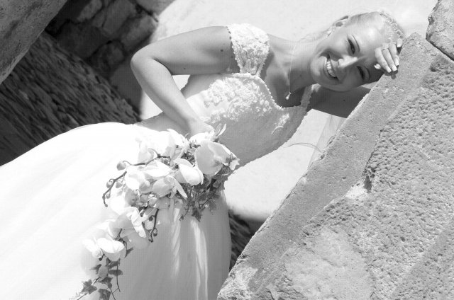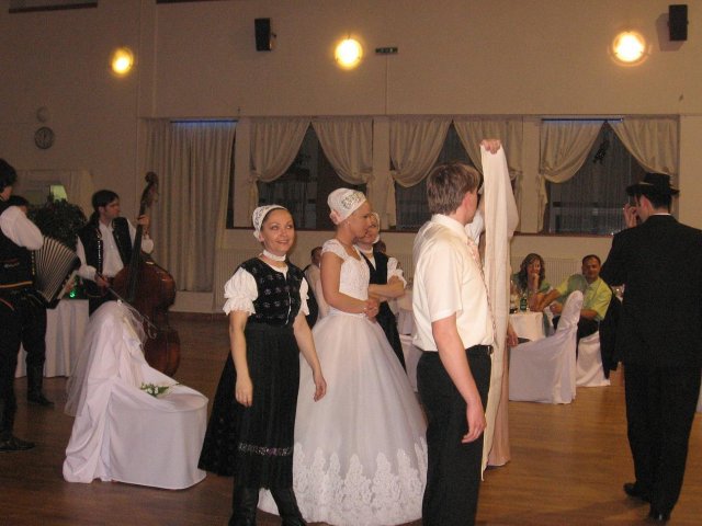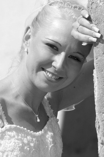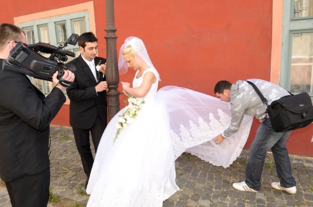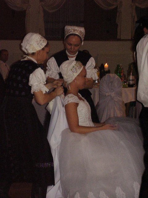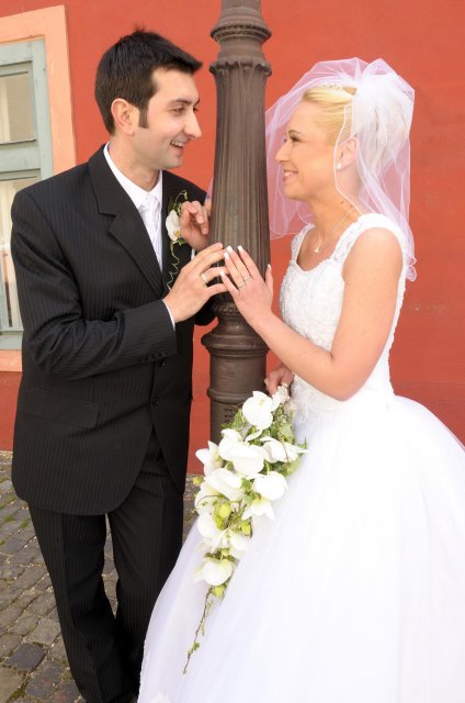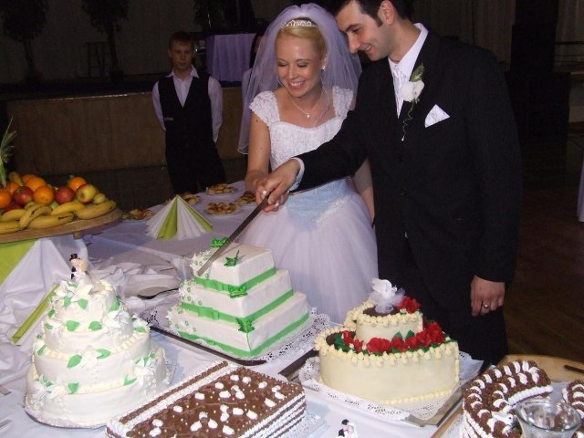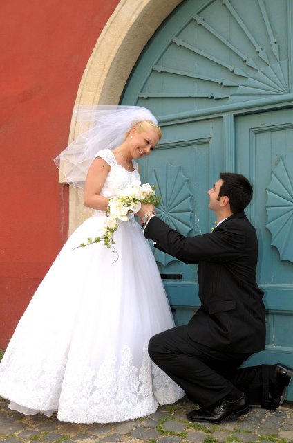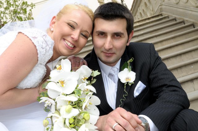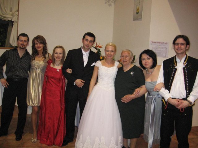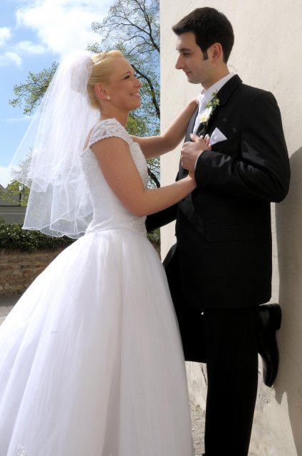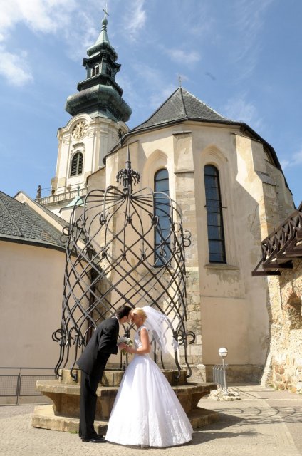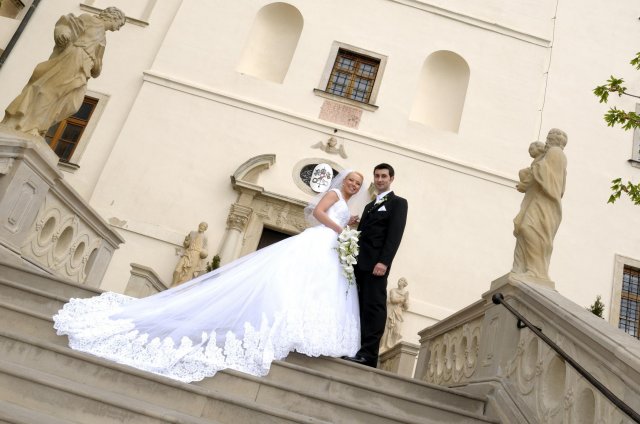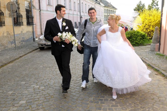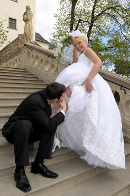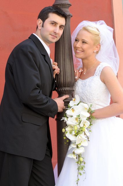 Moj svadobný deň? Nevedela som si ho vobec predstavit, kedze sa predpoved pocasia obratila proti nam :( ... do piatku vecera som hľadala pozitívne myšlienky o tom co budem robit ked bude prsat, že moja 2 metrova vlečka ostane nepoužitá. Nakoniec som po dlhej modlitbe za pocasie bez dažda zaspala ako malé mača. Rano sa začínalo pokojne, moja tetuška Martuška, čo mi robila môj dokonalý účes prišla v dohodnutý čas k nám domov. Po učesaní k nám prišla moja drahá priateľka Mimi, ktorá sa postarala o perfektný make-up. Takto učesaná namejkapovaná som skočila do šiat za pomoci mojich zlatých priateliek a takto počkala na mladého zaťa, s ktorým sme už v našom svadobnom autíčku zašli do Nitry pod hrad nafotit zopar pamätných záberov... posudte sami ako sa podarili :o) ... vietor sa striedal s mrakmi, cez ktore sa obcas predralo slniecko .... nas den bol jedinecný, nezabudnuteľný a hlavne fakt rozprávkový... lepsie by som si ho nevedela naplanovat... neboli ziadne stresy, neprsalo, vsetky doležite časové termíny boli dodržané... Dnes je už mesiac po svadbe a ja mam stale prijemné a pekné spomienky na celý ten náš svadobný deň. .... mladé dámy budúce nevesty-manželky... prajem vam aby ste ten vaš den prežili bez stresov, nahanačiek, v opojení lásky vas dvoch a hlavne aby vam to takto vydržalo naveky ... ahojte :o)))