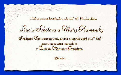 už sa nám to blíži....zatiaľ máme zajednanú sálu, kostol, kvetinárku, šaty, starejšieho, hudbu, fotografa a kameramana v jednom, obrúčky, poháre a zdá sa, že aj organistu a vizážistku. Takže už treba zohnať len zákusky, torty, topánky, samozrejme alkohol a kaderníčku a asi milión drobností.