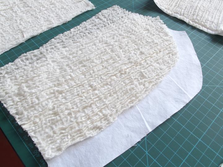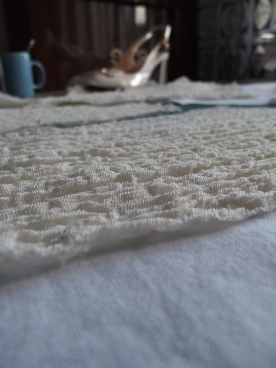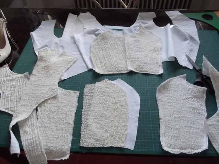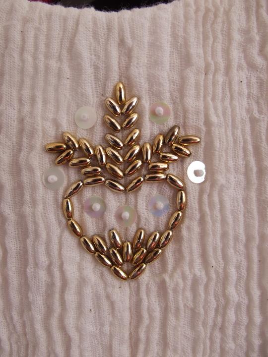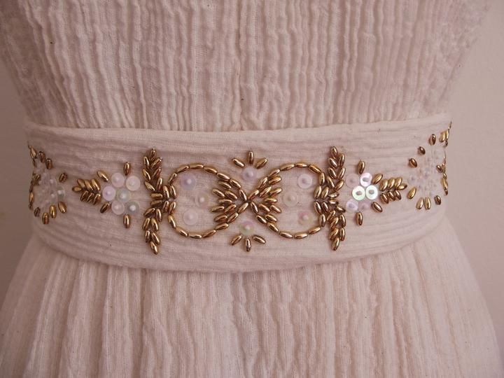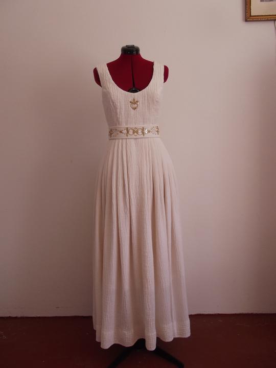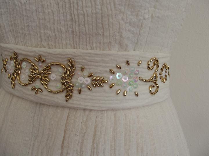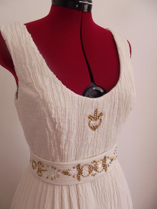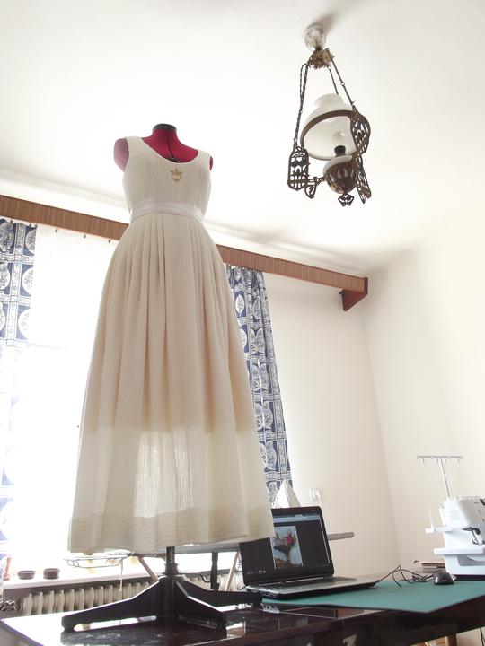 Látky som už mala kúpené - bavlnené plátno biele, režné a gázovinu. Najťažšie bolo nájsť en tsprávny strih. Chcela som, aby vychádzal z trnavského kroja, ale zároveň, aby bol súčasný, sexy a pohodlný - v obidvoch našich rodinách sa zvykne poriadne žúrovať a tancovať, takže žiadne torty a korzety nepripadali do úvahy. Svadobnú zábavu som si chcela užiť, nie ju celú pretrpieť. Nakoniec som zvolila strih podľa ženskej krojovej vesty, s ramienkami a sukňu som riasila podľa krojovej zástery. Jednoduché šaty som doplnila zlatou výšivkou - tradičnými ryžovými korálikmi a perleťovými plochými flitrami. Pôvodne som chcela použiť vyšívanie zlatou niťou, ale podstatne som nestíhala :D.