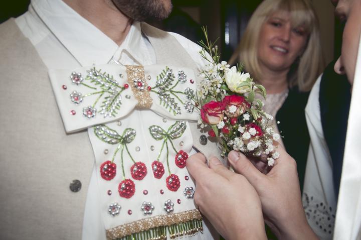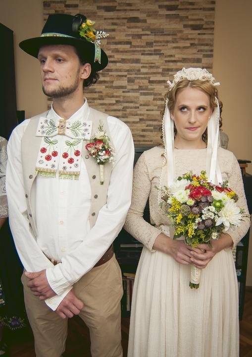 Potom prišla na radu ženíchova vesta, ktorú som celú ušila podľa trnavského kroja z ľanového plátna a vyšila rovnakým spôsobom ako šaty. Klobúk a mašľu som mu vyšila ešte dávnejšie. Košeľu a nohavice sme kúpili v hmku. Sako nepripadalo do úvahy, keďže vesta bola zozadu vyšívaná, takže drahý bol veľmi rád, pretože neznáša obleky.