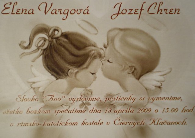 Už sa nám to blíži...Prípravy už vrcholia , už o chvílu sa naše životy spoja a my budeme konečne šťastní, presne tak ako o tom snívame.Sme spolu už 6a pol roka a za ten čas sme si obaja istí ze patrime k sebe... a už sa nevieme dočkať ked to spečatíme aj pred Bohom.Zatial mame zajednaného fotografa, salu, kostol, farara, obrucky, saty pre nevestu aj oblek zenichovi, pierka pre hosti aj svedkov, kyticka pre nevestu a pierko pre zenicha bude v bielo-bordovej farbe, samozrejme z ruzi, a vyzdoba saly bude tiez bielo-bordova!Aj výzdoba na auto je už hotova - samovýroba...Oznamenia su tiez hotove, všetko ide zatial podla planu, kiezby som si vedela ešte počasie objednat!:) Velmi sa na ten den tesime! Prepačte za copy...