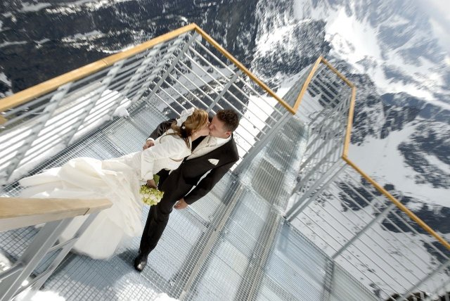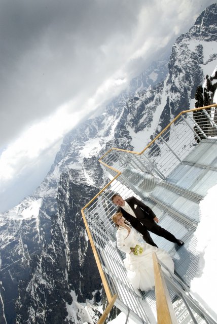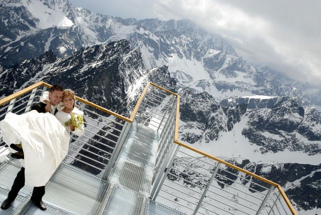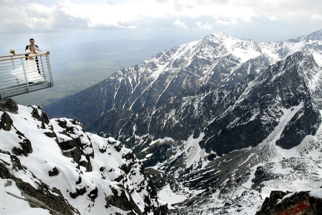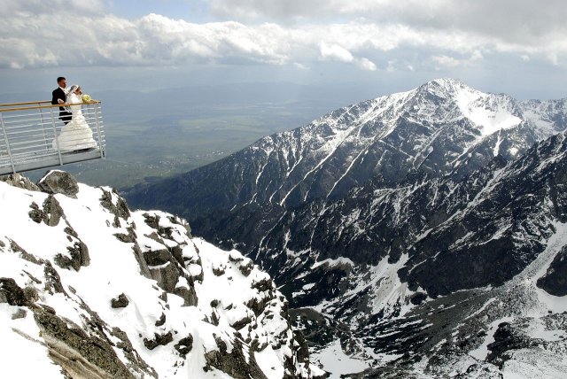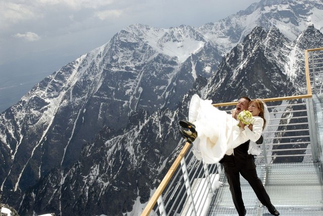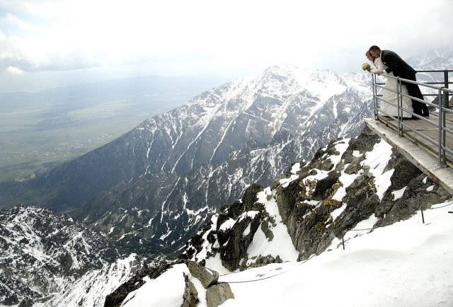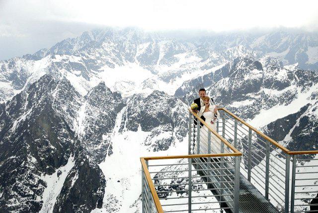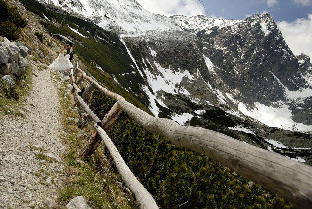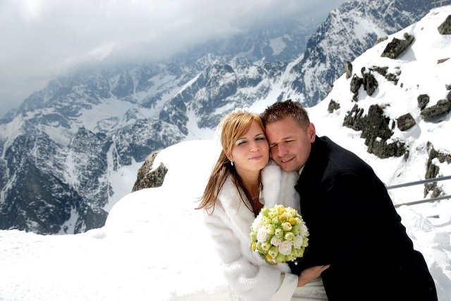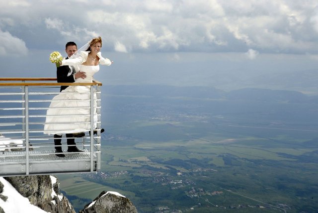 Nápad vznikol pri stretnutí s fotografom ako narážka, že my pôjdeme hoc aj na Lomnicky štíť, zasmiali sme sa, že aj on nemá s tým problém. A od tej chvíle mi to vŕtalo v hlávke, až som nahovorila manžela, že je to úžasný nápad. Spravili sme pre to všetko, počasie viselo na vlásku, fúkal silný vietor, týždeň pred fotením nasnežilo, aj keď svadba bola v júni, vyzeralo to ako v čarovnej zime. Neverila som tomu, že to vyšlo, až keď som sa ocitla na Lomničáku, pri vystupovaní z lanovky turisti začali tlieskať :o) A potom to začalo, úžasný pocit voľnosti a radosti zo svadobného dna, aj hory sa s nami tešili. Poriadne sme si to užili, srandy bolo kopec a o pekných výhľadov ani nehovorím. Srdiečko mi plesalo dvojnásobne, keďže milujeme naše Tatry ktoré boli v tento úžasný deň s nami :o)))
