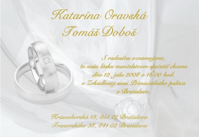 Nasa svadba sa bude konat 12. jula 2008 v Bratislave......po krasnych 9 rokoch nasho spolocneho vztahu :)))