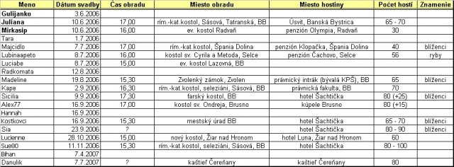 Tak dievčatá, tu je naša tabuľka (zatiaľ neúplná, dopíšte mi údaje do nášho fóra) s našimi svadbami (dátumy, časy, miesta obradu, hostiny, ...).