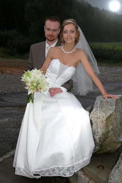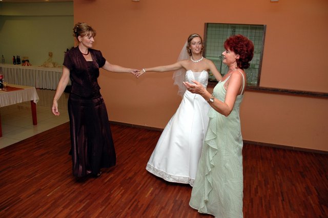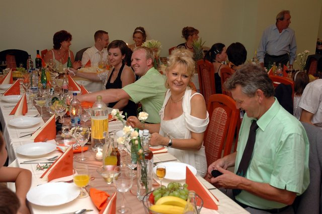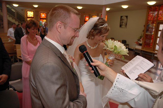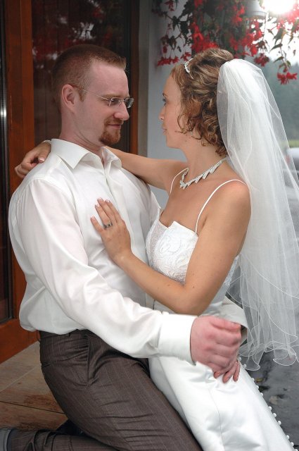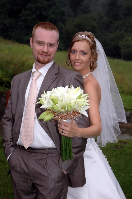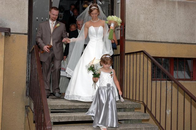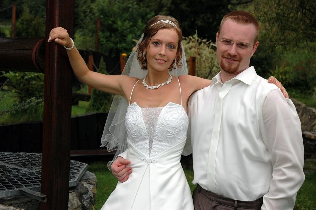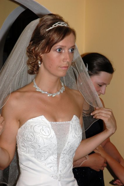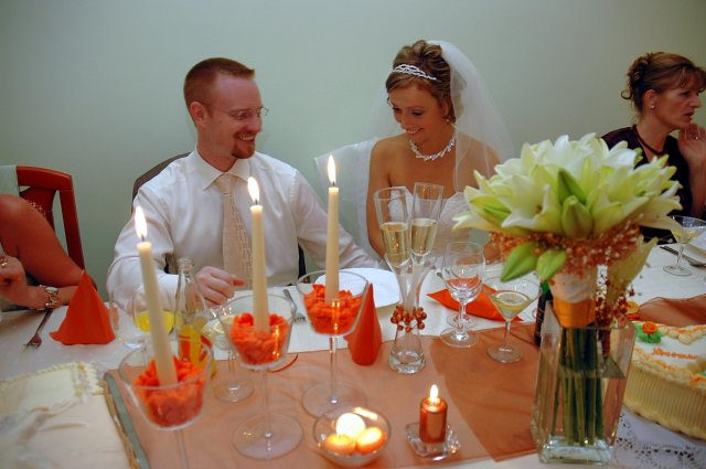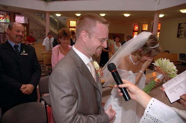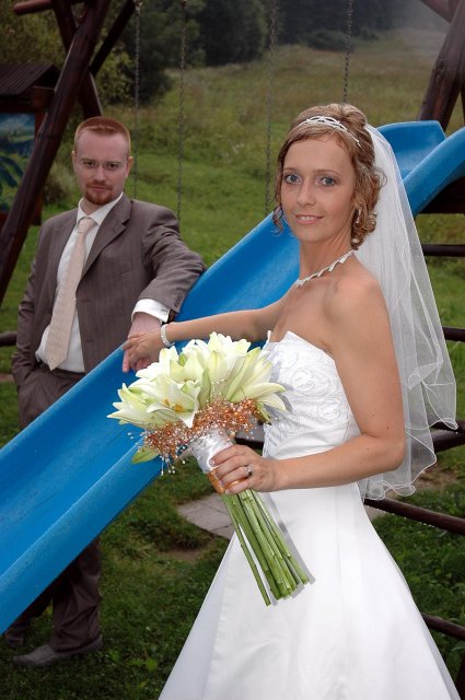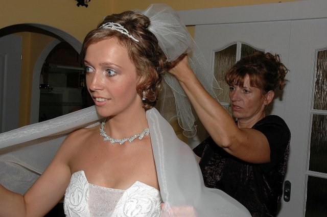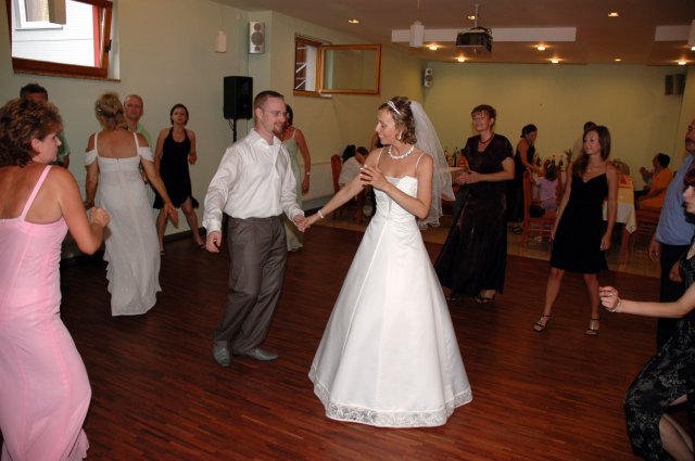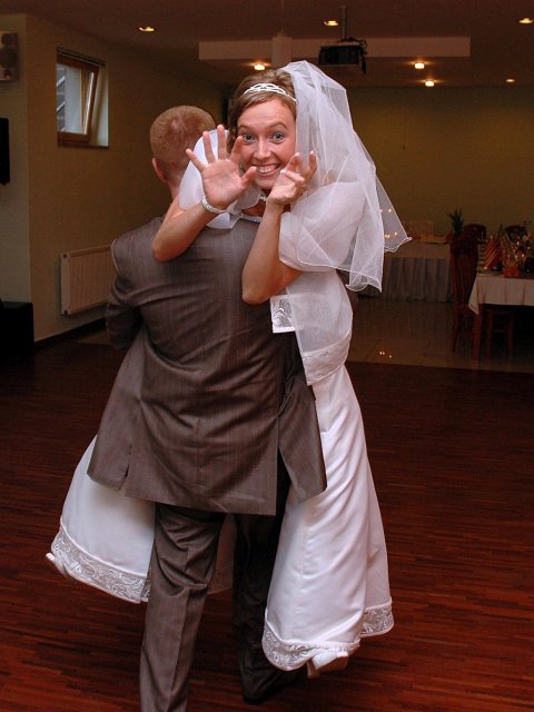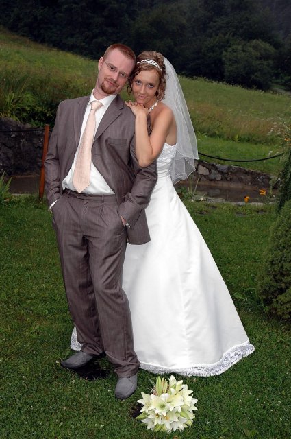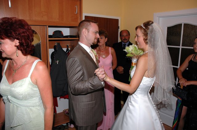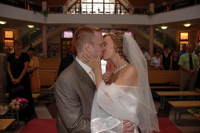 ... od rána svietilo slniečko .... rýchlo som zabehla k našim, potom bol na rade účes, za ním líčenie. Učesaná, nalíčená, so závojom na hlave, v teniskách a športovom oblečení som ešte utekala domov vyvenčiť môhjo hafkáča (ľudia sa po nás pozerali, ako keby ešte nikdy nevideli vydajachtivú žienku s veľkou čiernou vlčiačkou :)) a už sme aj s fotografom sedeli v aute k mojim rodičom. Prišlo na rad obliekanie všetkých prítomných žien a dievčat a potom už len netrpezlivé čakanie na môjho skoromanžela. Keď k nám zabúchal aj so svojou najbližšou rodinou na dvere, srdiečko mi skoro vyskočilo z hrude. Okamžite, ako som ho zbadala, bola všetka nervozita preč. Prišli sme pred kostol a pán kaplán si nás odviedol dnu. Prvých pár minút bol v kostole takmer každý človek vážny. Všetko zmenil môj manžel, ktorý pri sľube namiesto Ja, Peter, beriem si Teba, Monika.... začal: Ja, Monika, beriem si.... viac nám nebolo treba.. celý kostol sa začal rehniť a ten smiech sa niesol aj celým večerom. Po skončení obradu sme ani nestihli vyjsť pred kostol a spustil sa poriadny dážď... no čo, pršalo nám veľa, veľa šťastia :) zábava bola naozaj skvelá, hostia sa bavili od prvého tanca až po záverečný... DJ nám hral, kým sme vládali tancovať....