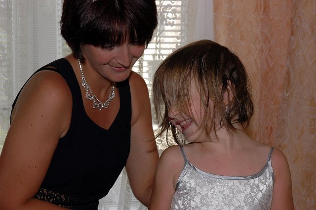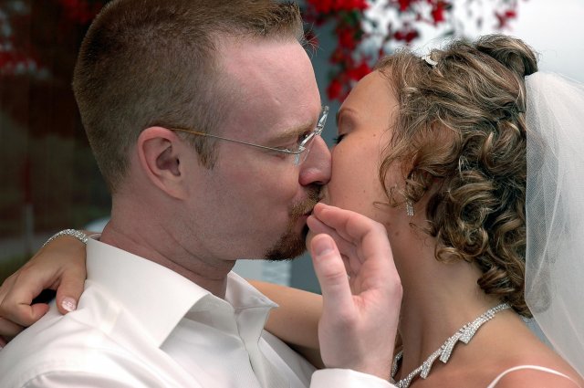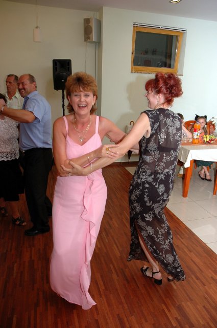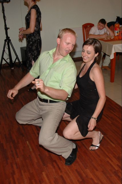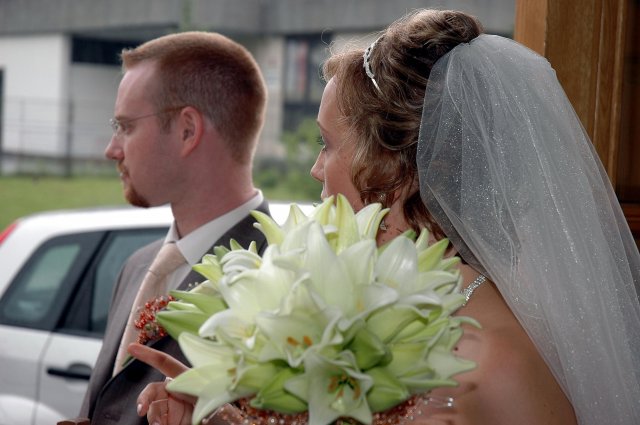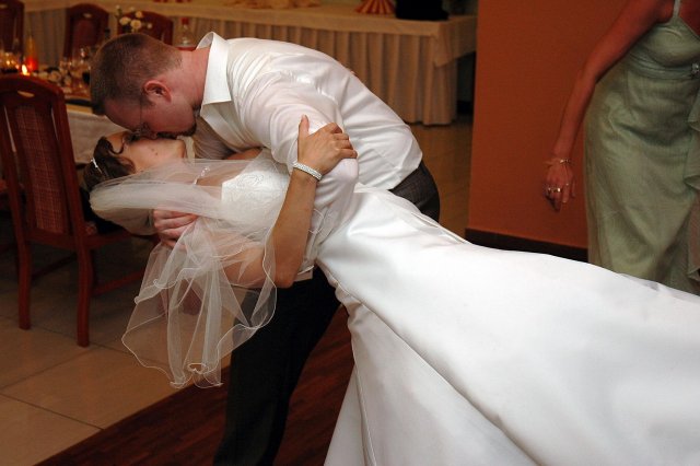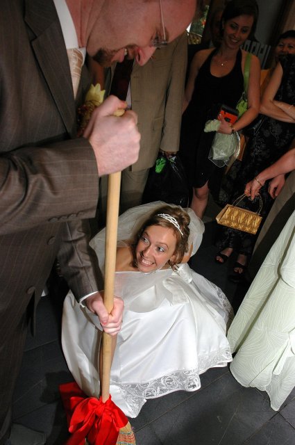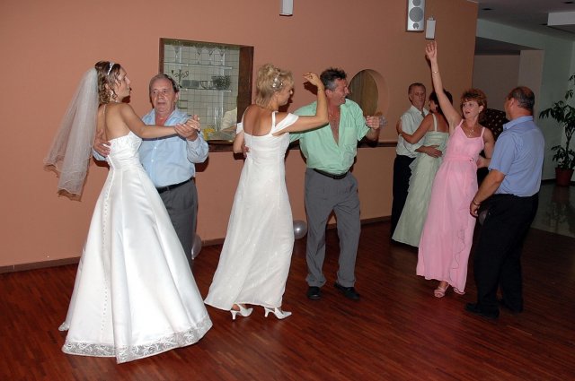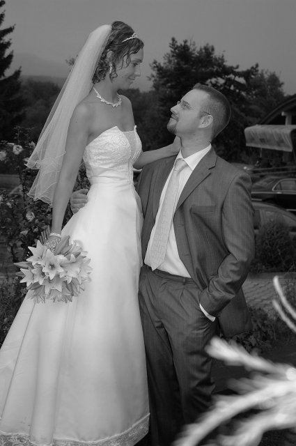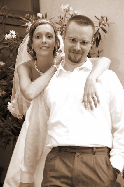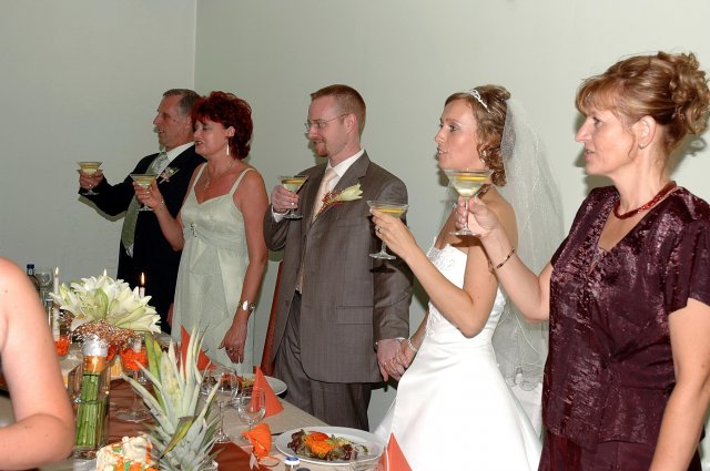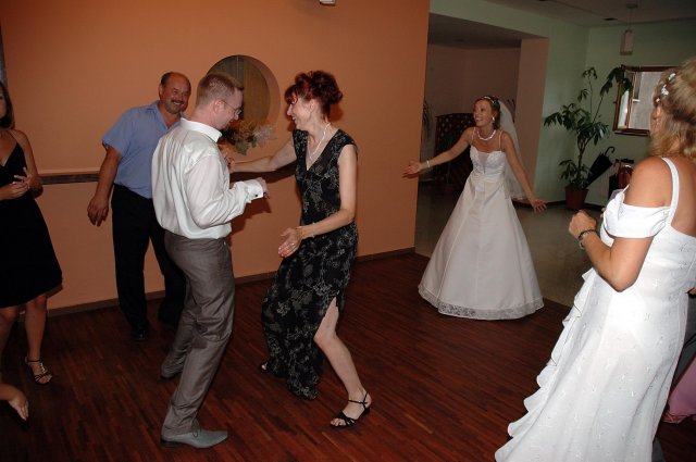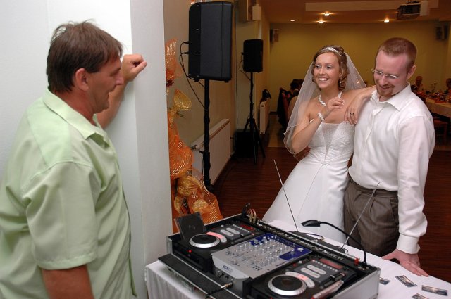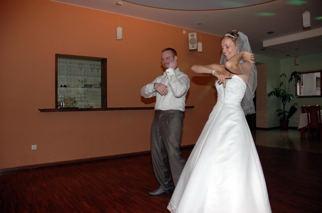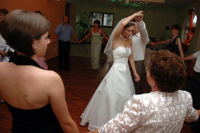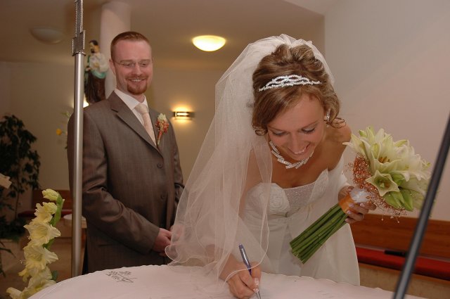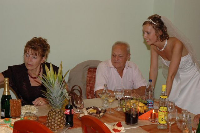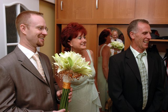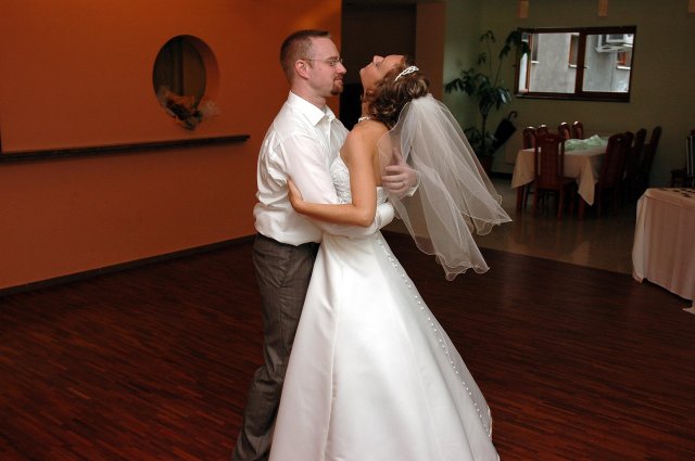 ... od rána svietilo slniečko .... rýchlo som zabehla k našim, potom bol na rade účes, za ním líčenie. Učesaná, nalíčená, so závojom na hlave, v teniskách a športovom oblečení som ešte utekala domov vyvenčiť môhjo hafkáča (ľudia sa po nás pozerali, ako keby ešte nikdy nevideli vydajachtivú žienku s veľkou čiernou vlčiačkou :)) a už sme aj s fotografom sedeli v aute k mojim rodičom. Prišlo na rad obliekanie všetkých prítomných žien a dievčat a potom už len netrpezlivé čakanie na môjho skoromanžela. Keď k nám zabúchal aj so svojou najbližšou rodinou na dvere, srdiečko mi skoro vyskočilo z hrude. Okamžite, ako som ho zbadala, bola všetka nervozita preč. Prišli sme pred kostol a pán kaplán si nás odviedol dnu. Prvých pár minút bol v kostole takmer každý človek vážny. Všetko zmenil môj manžel, ktorý pri sľube namiesto Ja, Peter, beriem si Teba, Monika.... začal: Ja, Monika, beriem si.... viac nám nebolo treba.. celý kostol sa začal rehniť a ten smiech sa niesol aj celým večerom. Po skončení obradu sme ani nestihli vyjsť pred kostol a spustil sa poriadny dážď... no čo, pršalo nám veľa, veľa šťastia :) zábava bola naozaj skvelá, hostia sa bavili od prvého tanca až po záverečný... DJ nám hral, kým sme vládali tancovať....