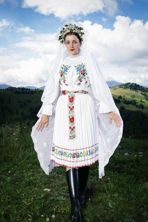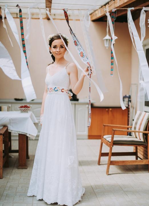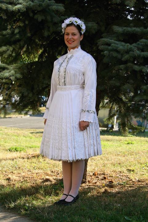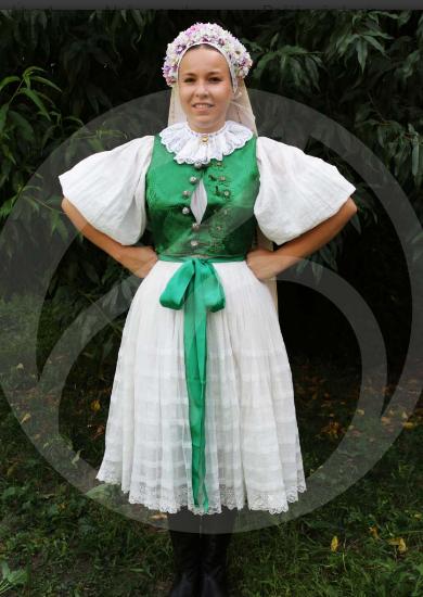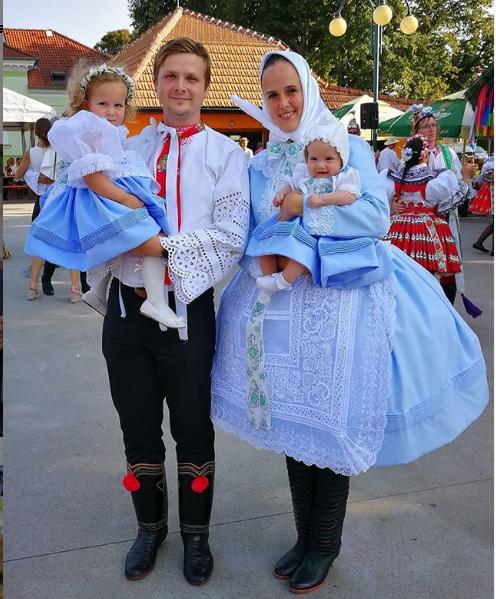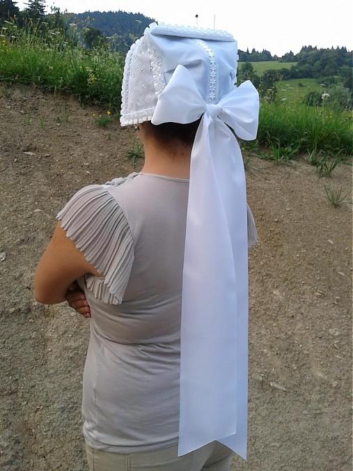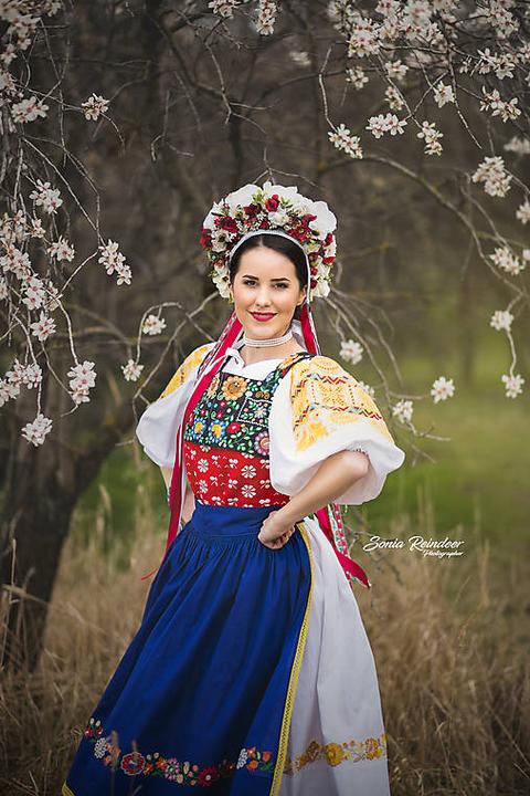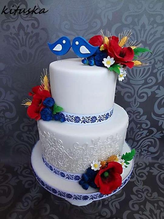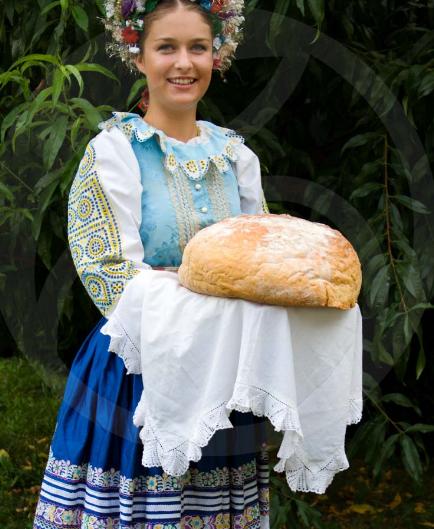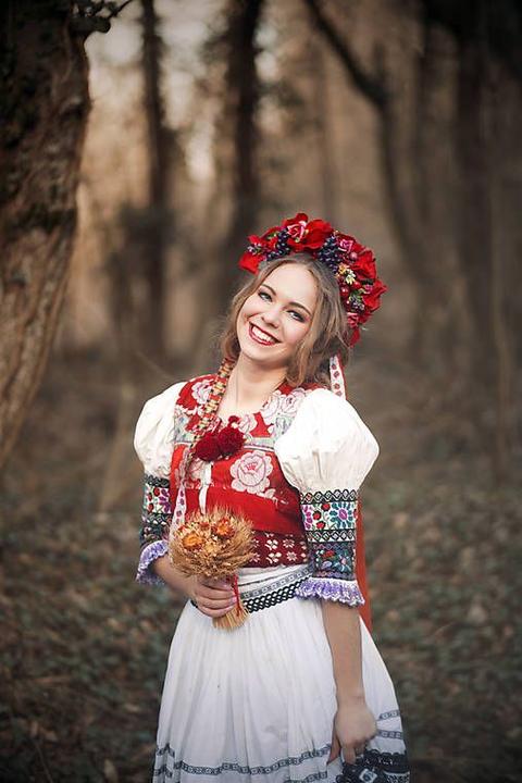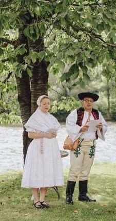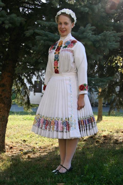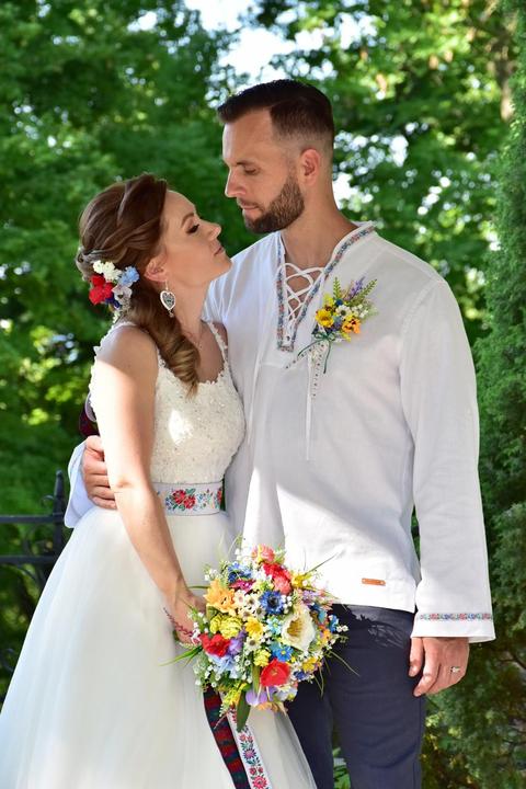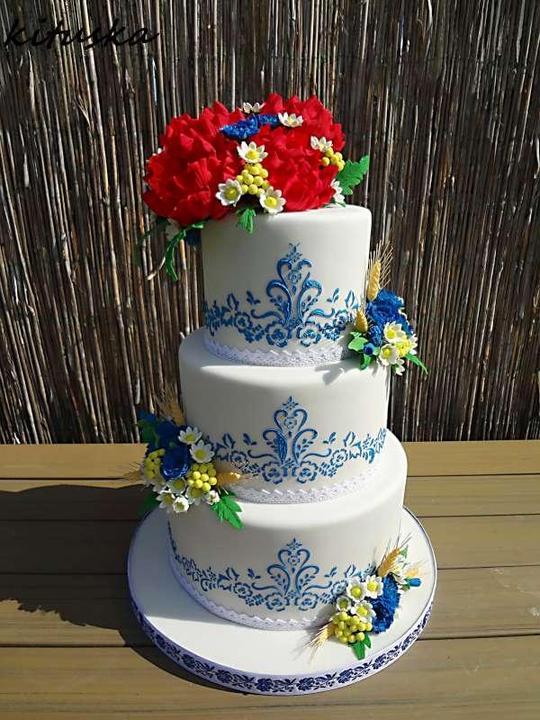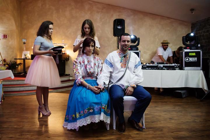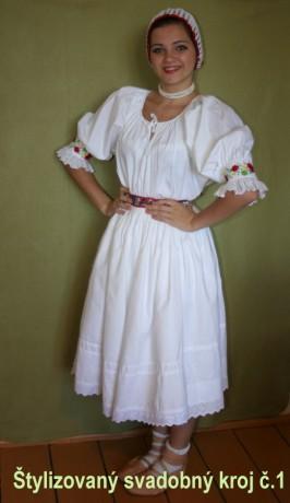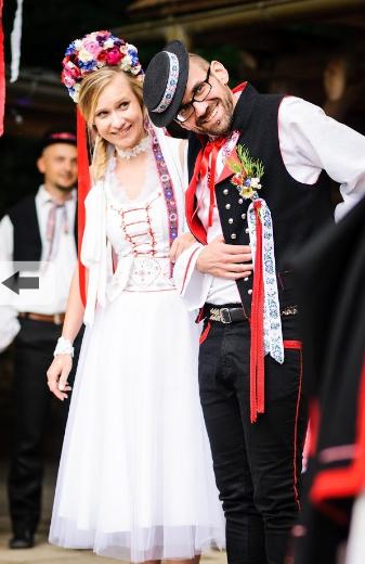 3. Po svadobnom obede sa bude slávnostne krájať torta a my sa na to prezlečieme - ja do bielych šiat zdobených folklórnym motívom a na hlavu čepiec a ženích do modrých nohavíc, bielej zdobenej košele, s trakmi, motýlikom a slamenným kolbúkom.