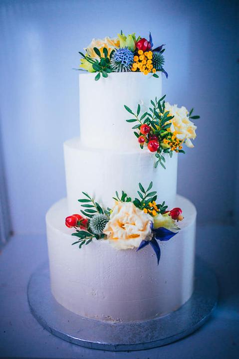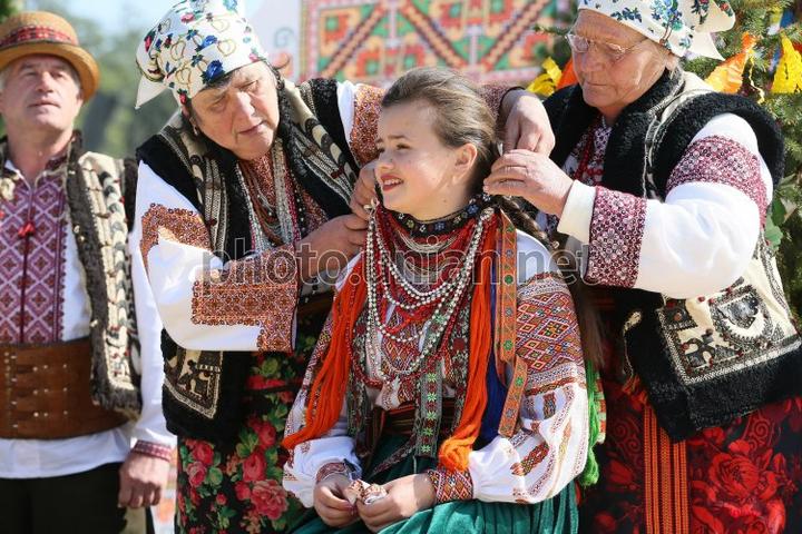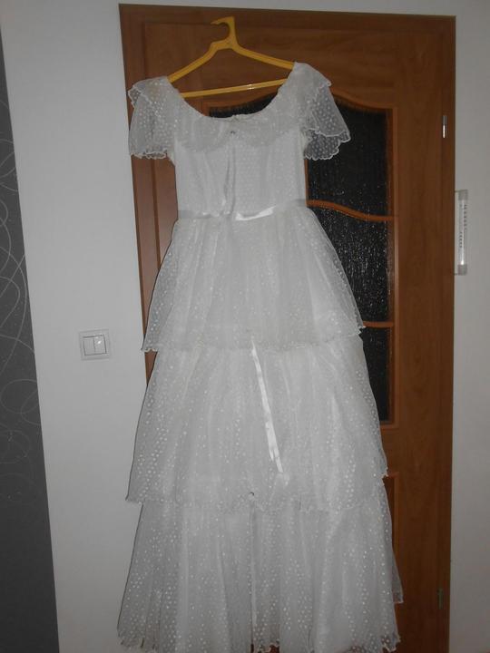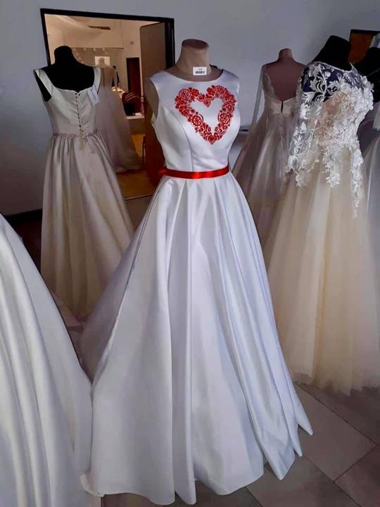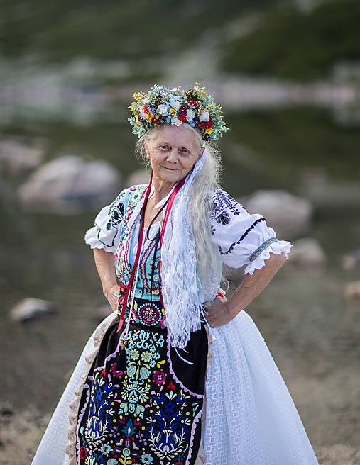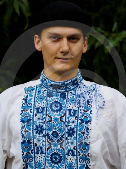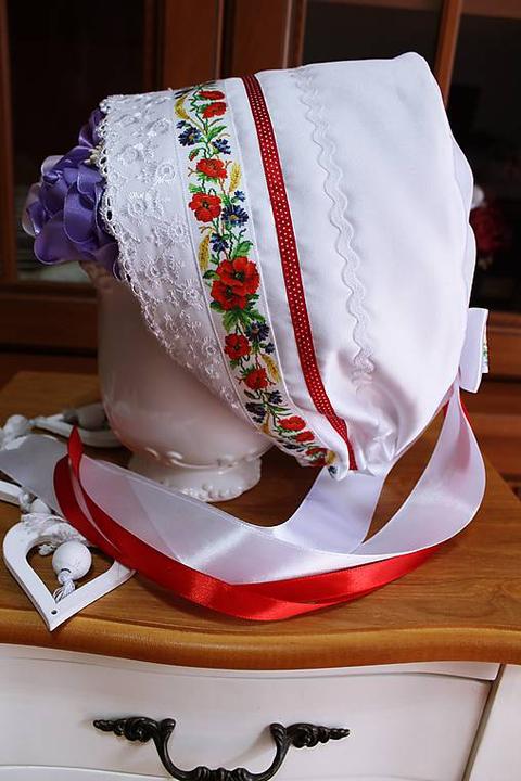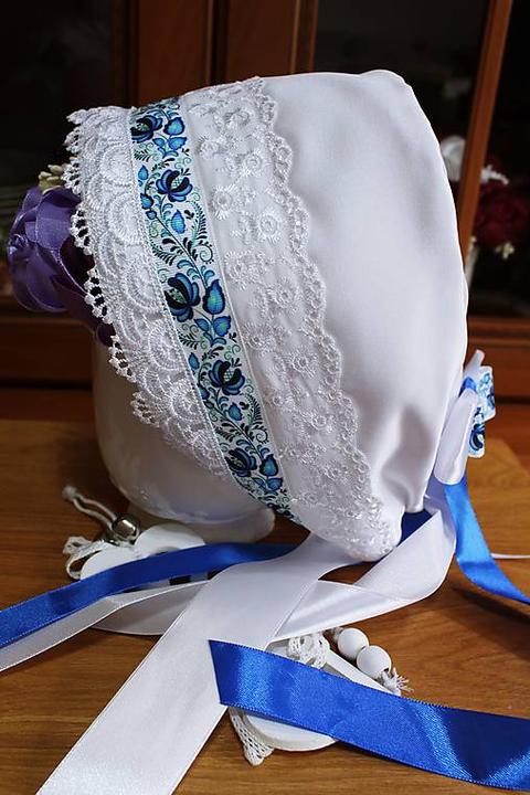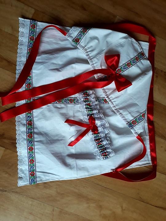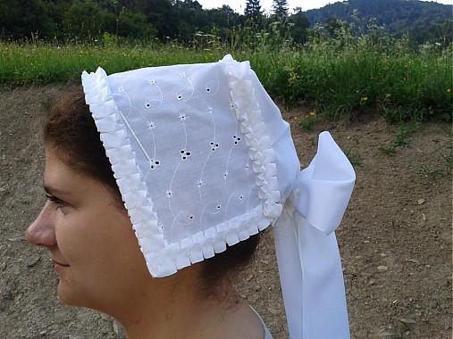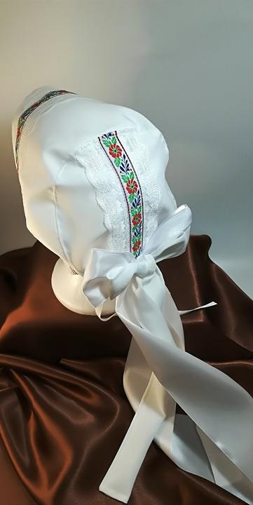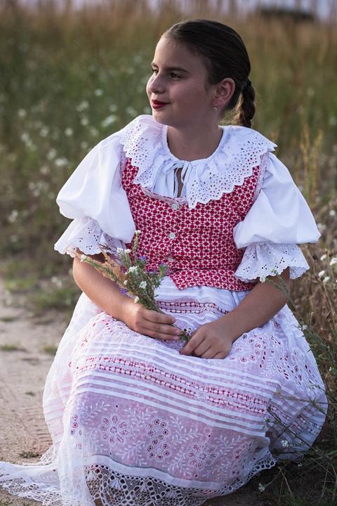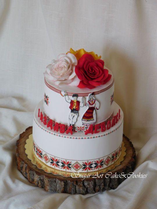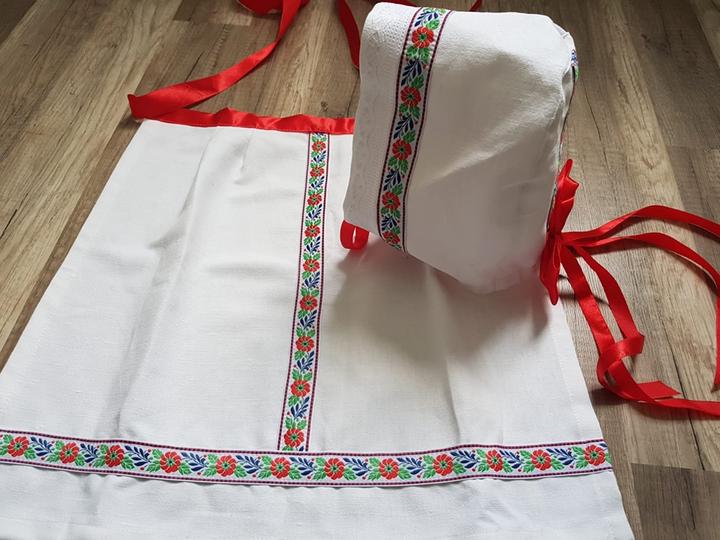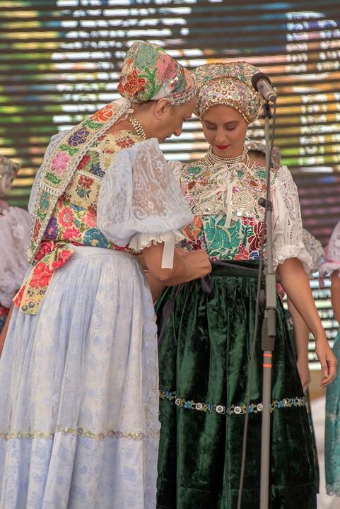 3. Po svadobnom obede sa bude slávnostne krájať torta a my sa na to prezlečieme - ja do bielych šiat zdobených folklórnym motívom a na hlavu čepiec a ženích do modrých nohavíc, bielej zdobenej košele, s trakmi, motýlikom a slamenným kolbúkom.