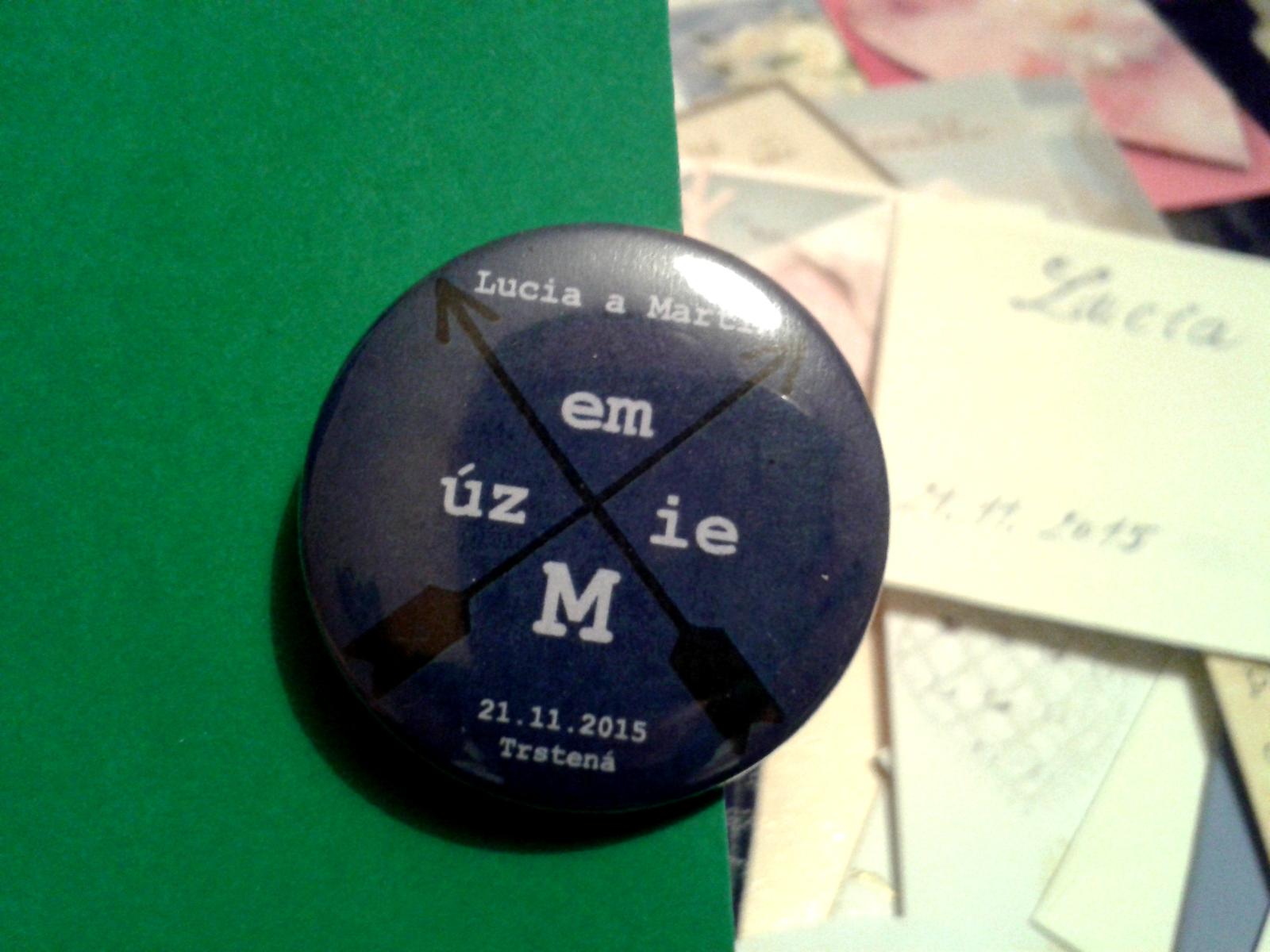 mali sme ustrednu temu, ktoru sme nechali zapracovat do grafiky a potom sme dali vytvorit odznaky velkosti 37mm, co je uplne akurat. chlapi mali ich ako pierka ozdobene este aj stuhou, aby to bolo trosku ine a ostatne boli bez :)
