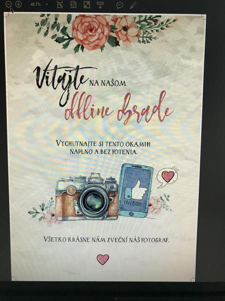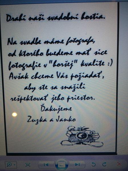 Ahojte. Chcela by som poprosiť či sa u niekoho nenájde kartička k oznámeniu ako jemne oznámiť hosťom aby sa trošku krotili pri fotení svadby telefónom, tabletom, atď.