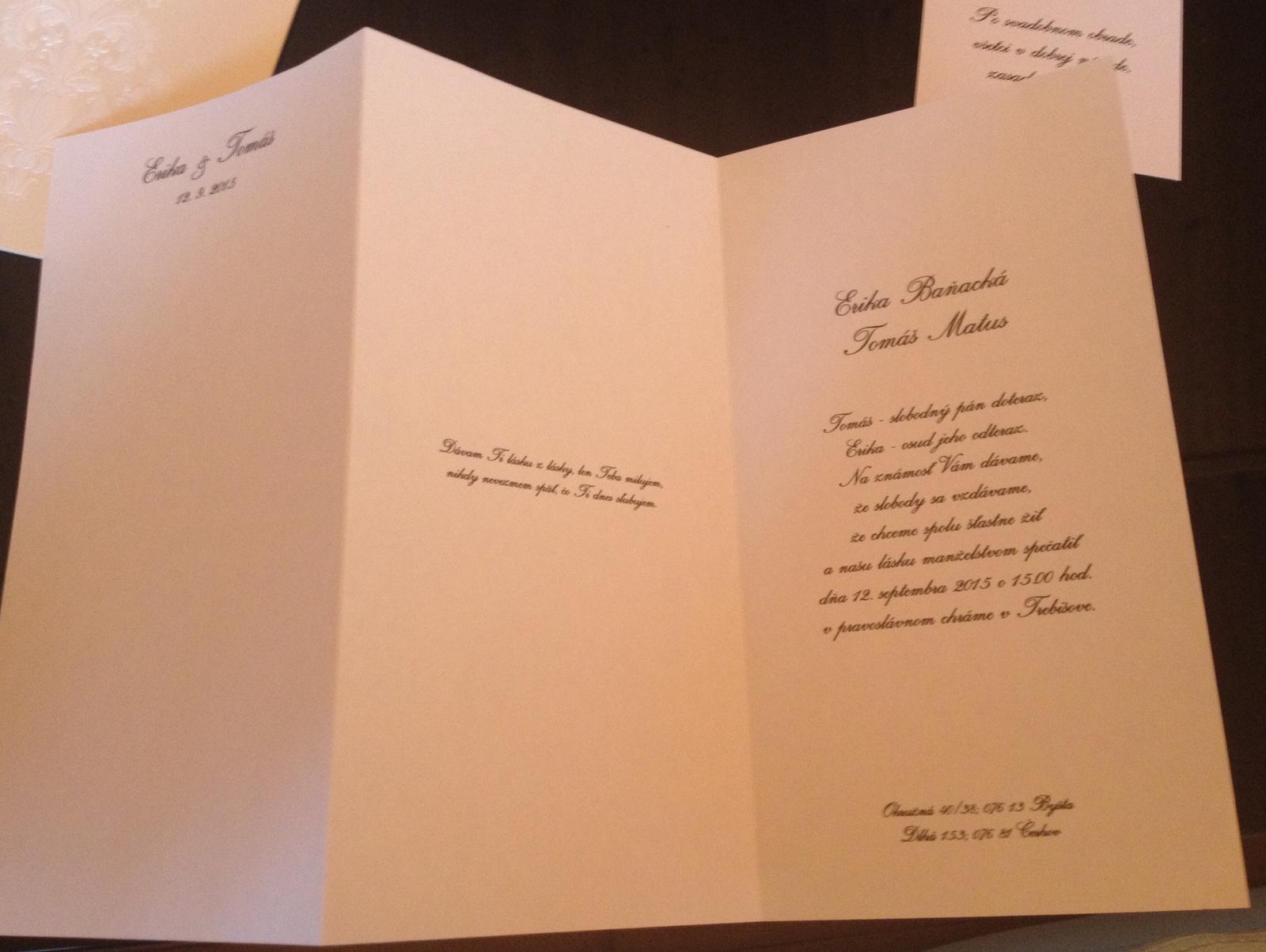 Toto je naše 8-) Odfotil nás a následne graficky spracoval kamarát, potom sme to dali už len vytlačiť. Vyšlo nás to celé za 5 eur (80ks oznámení, 40ks pozvánok) :-)