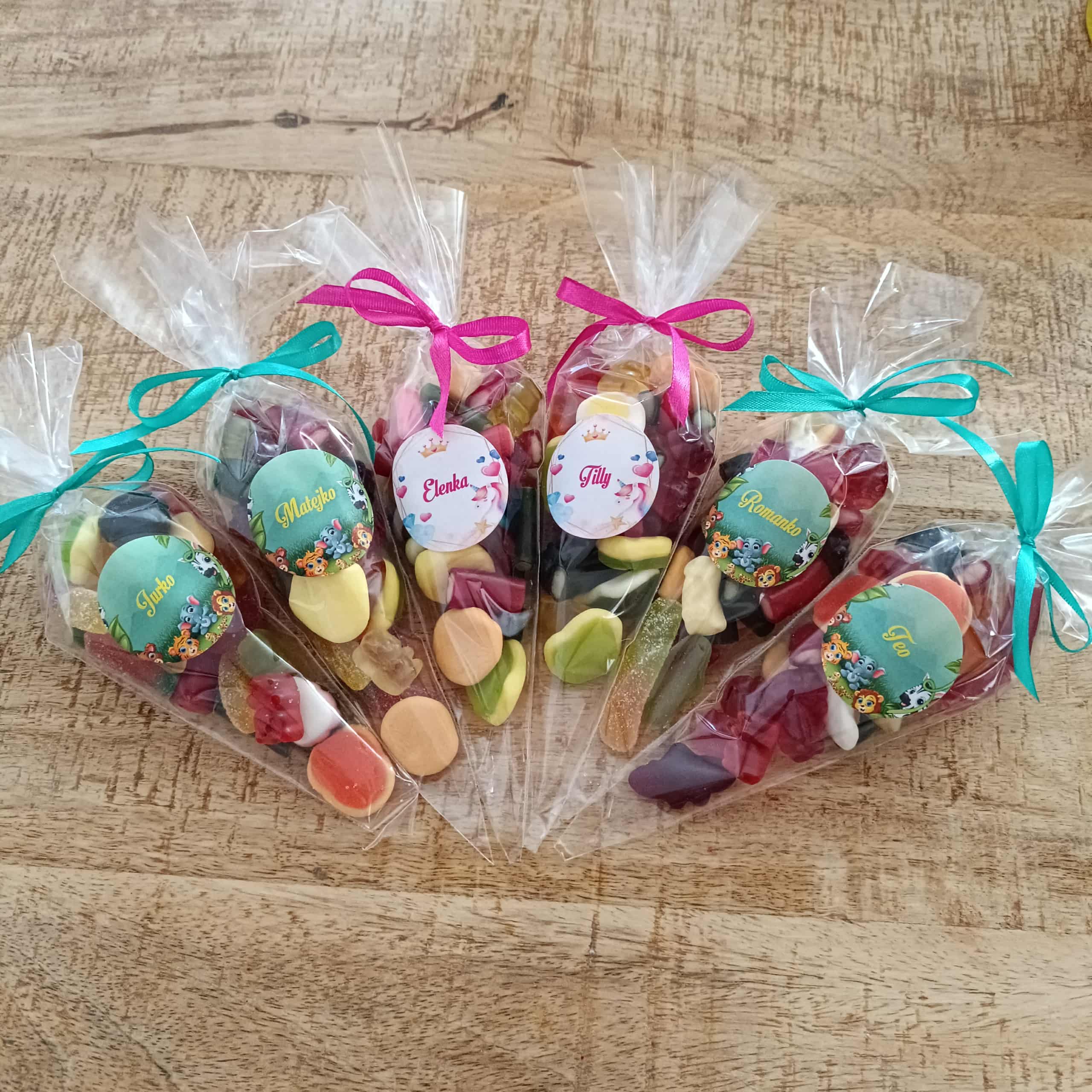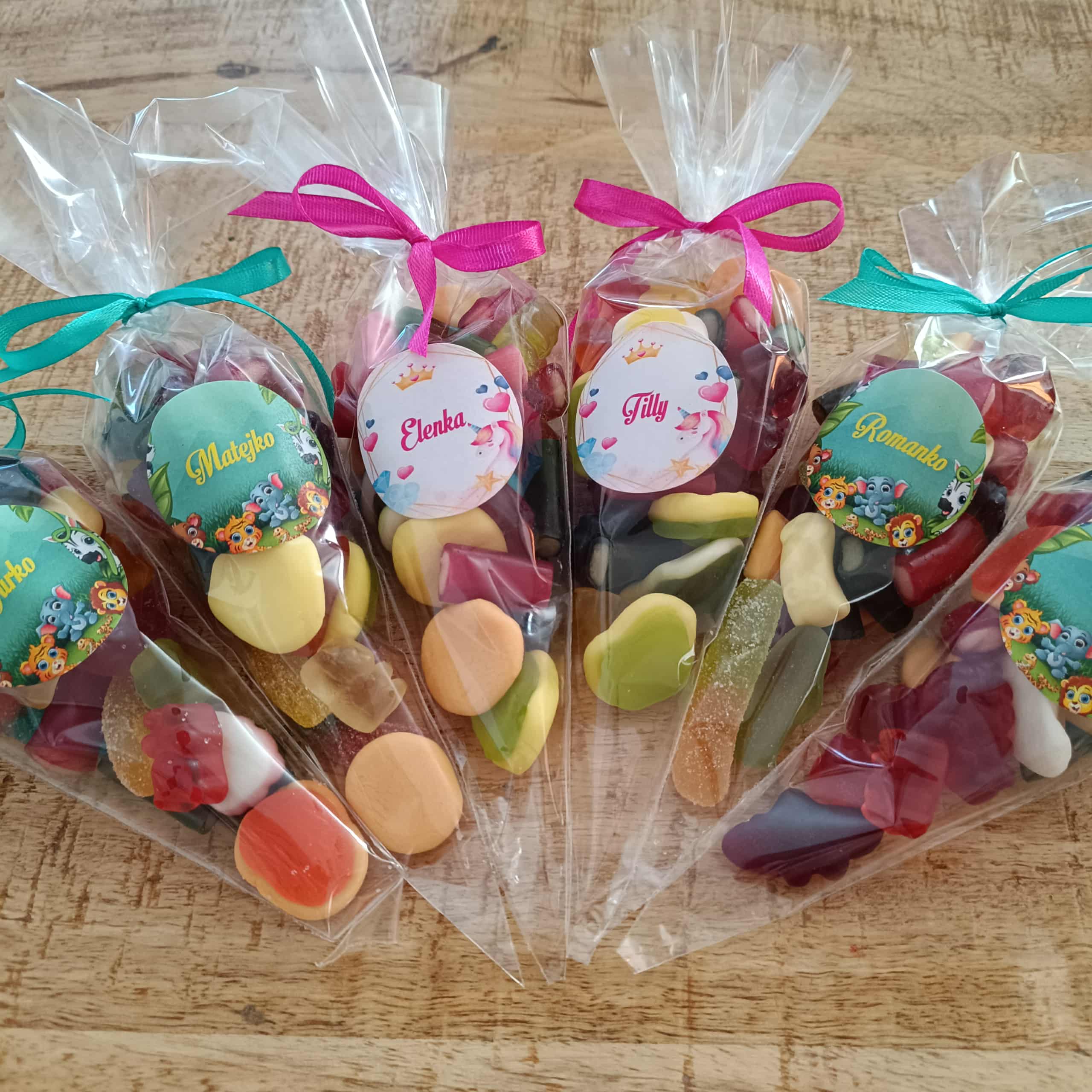Svadobný želatínový kornút obsahuje 100g želatínových cukríkov, saténovú stužku farby podľa vášho výberu a nálepku s menom alebo bez. Farba nálepky a dizajn je možné upraviť podľa vášho želania.
