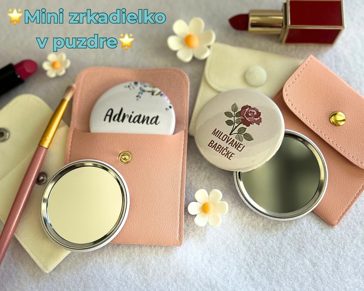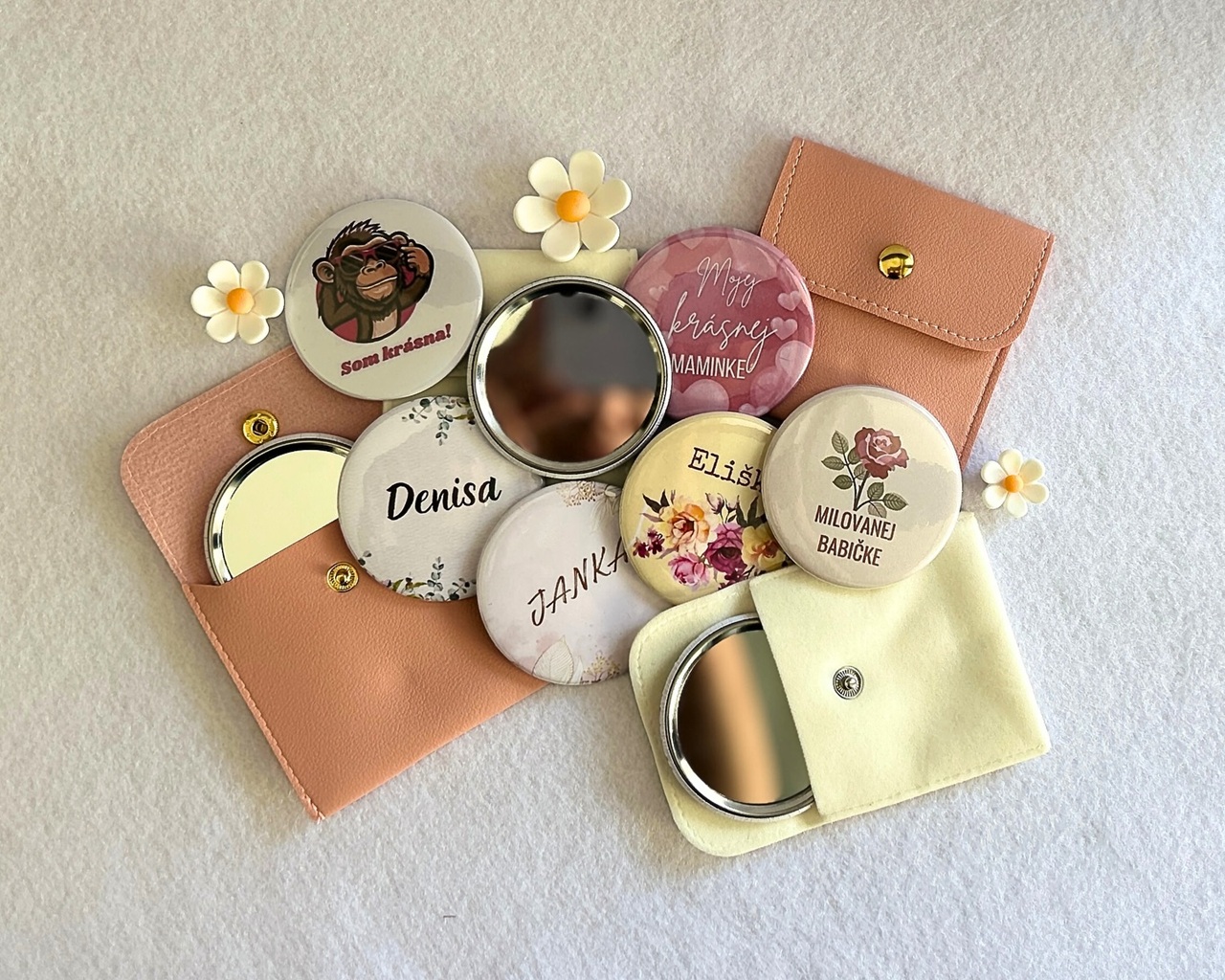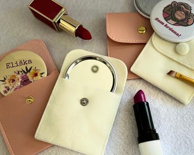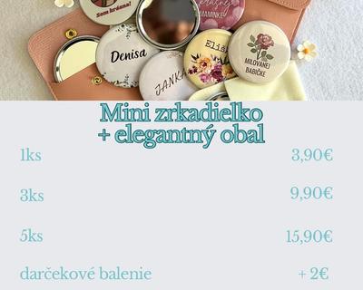 Mini zrkadielko do kabelky - štýlový a osobný darcek. Dodávané spolu s elegantným puzdrom, ktoré ich ochráni na dlhy čas. Vyrobím ti ich s menom, dátumom, odkazom alebo grafikou podľa želania. Krasne aj v darčekovej krabičke - hotový darček, ktorý poteší.