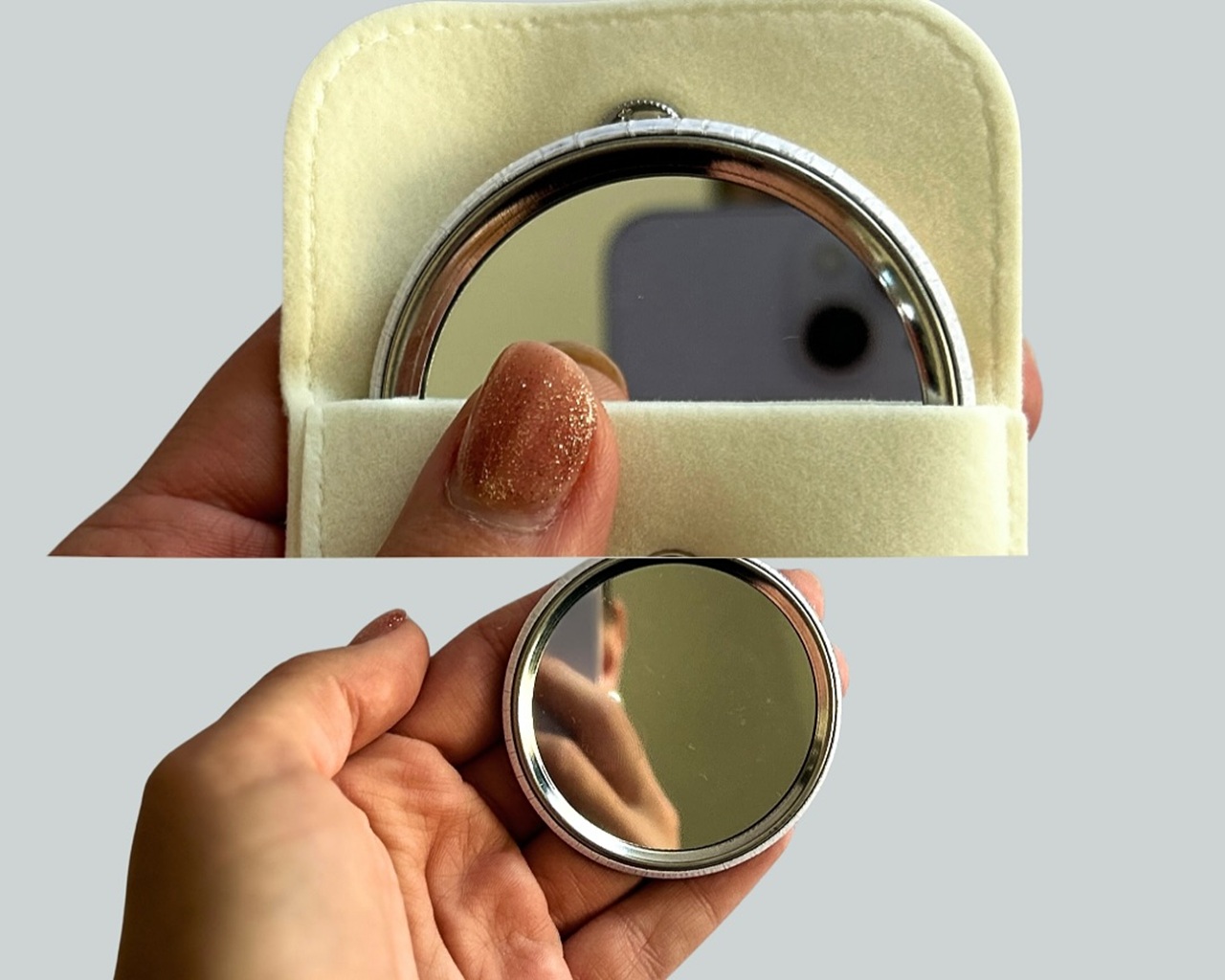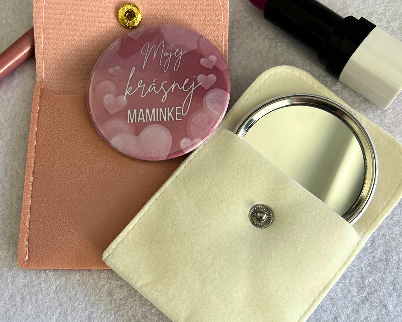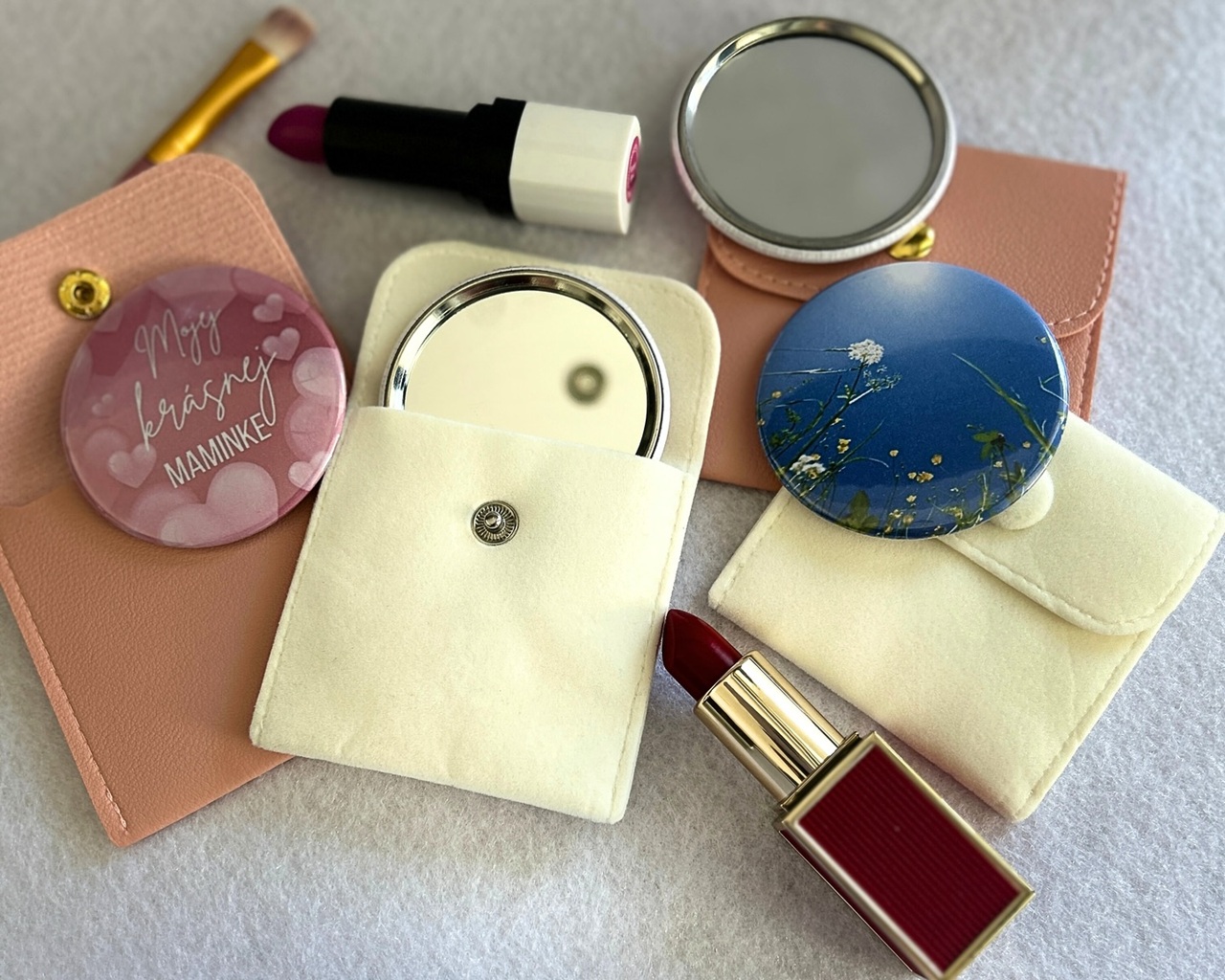 Mini zrkadielko do kabelky - štýlový a osobný darcek. Dodávané spolu s elegantným puzdrom, ktoré ich ochráni na dlhy čas. Vyrobím ti ich s menom, dátumom, odkazom alebo grafikou podľa želania. Krasne aj v darčekovej krabičke - hotový darček, ktorý poteší.