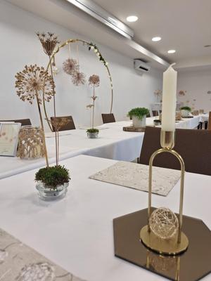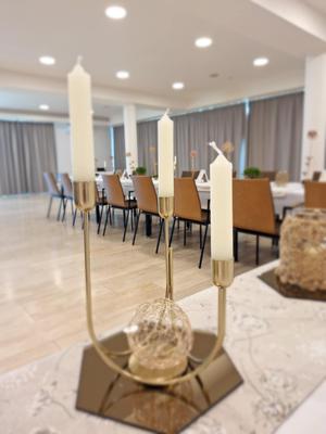 Na prenájom zlaté jednoramenné alebo trojramenné svietniky na kónické sviečky.