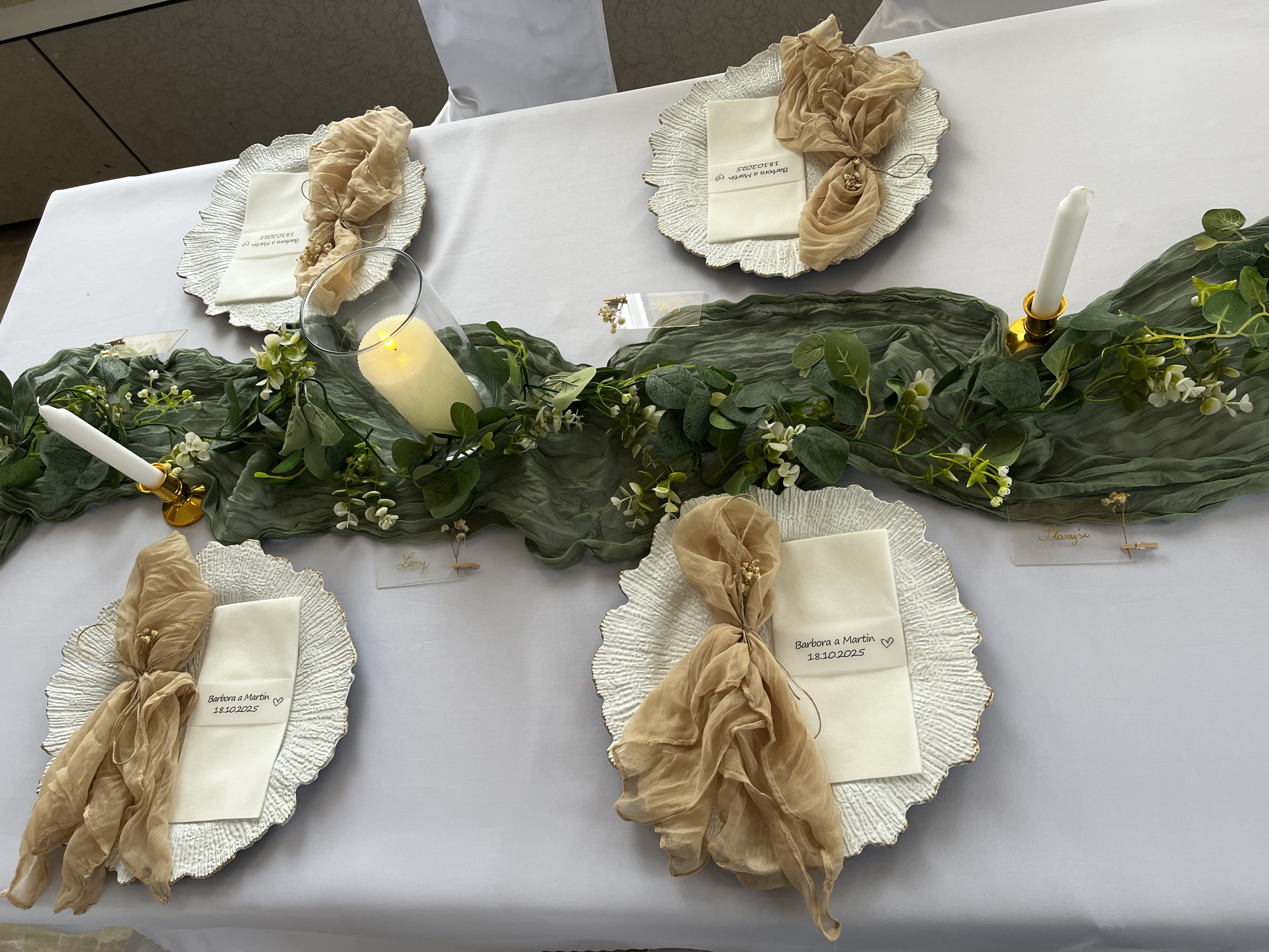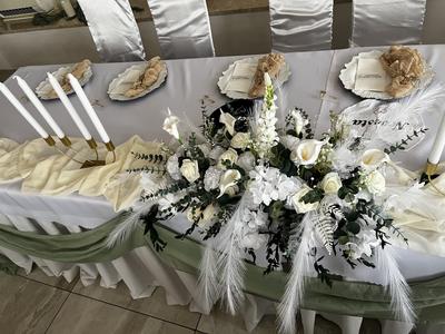 Ahojte, mám na predaj svadobnú výzdobu: - 95 krémových obruskov 60€ - 2 veľké zelene štoly 17€ - kytica na hlavný stôl 35€ - mala kytica na oblúk+ svetielka+drevene písmena 25€ - veľká kytica na oblúk+ svetielka+ 2 štoly 50€ - 33 cylindrov 100€ - 33 led sviečok (aj s baterkami) 100€ - 2 oblúky 80€ - 70 malých svetielok 10€ (fotky dopošlem) - 30ks girlandy na stoloch 15€ - stojan + uvitacia tabuľa 40€ (fotky doposlem) - biele masle 10ks 2€ - 20 náramkov pre ženy 20€