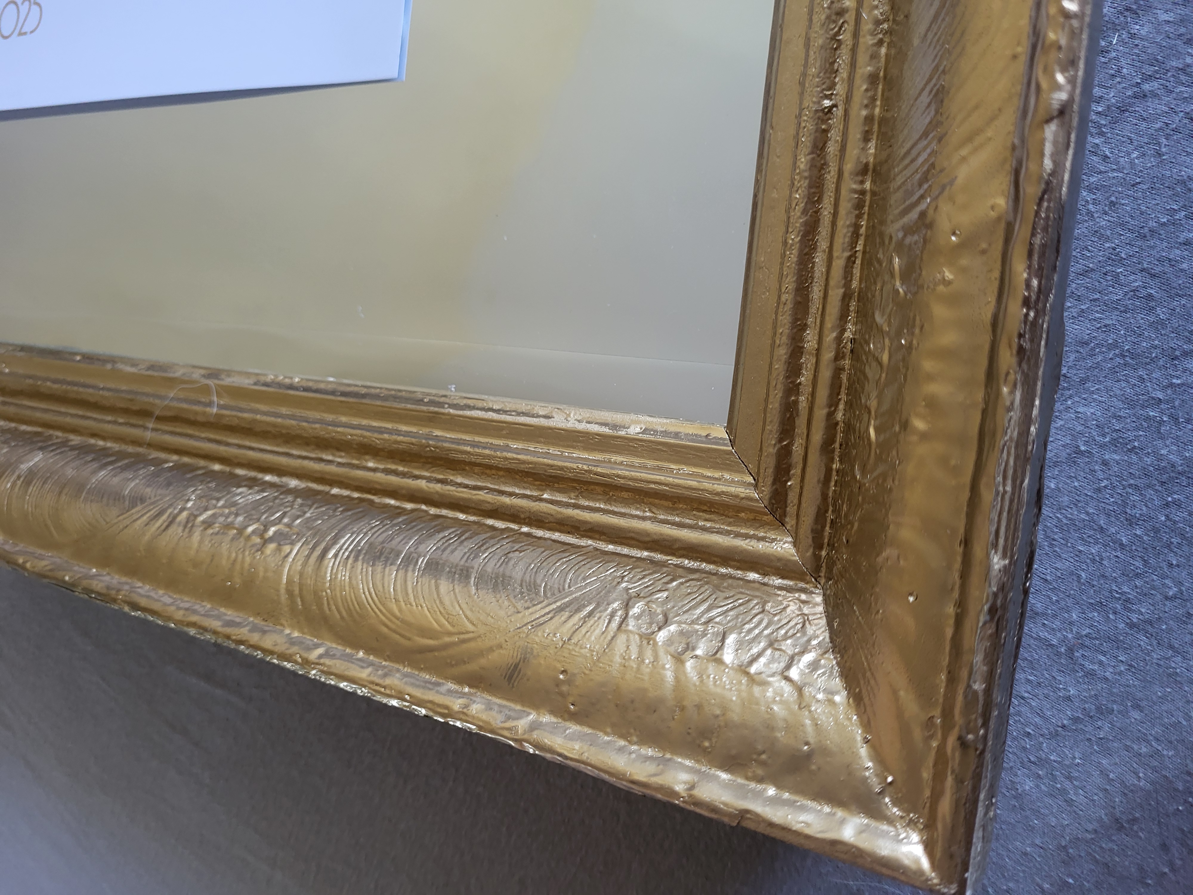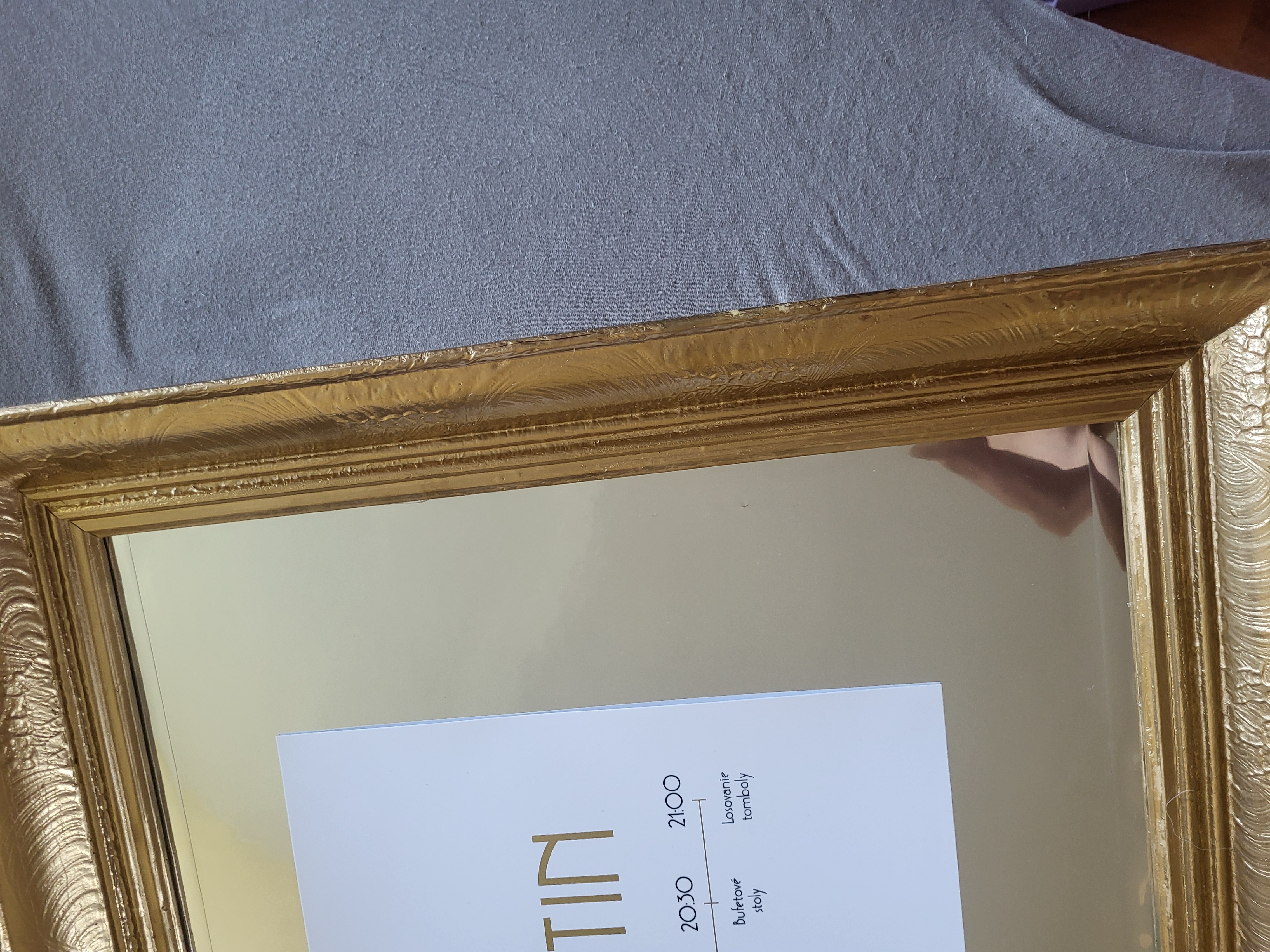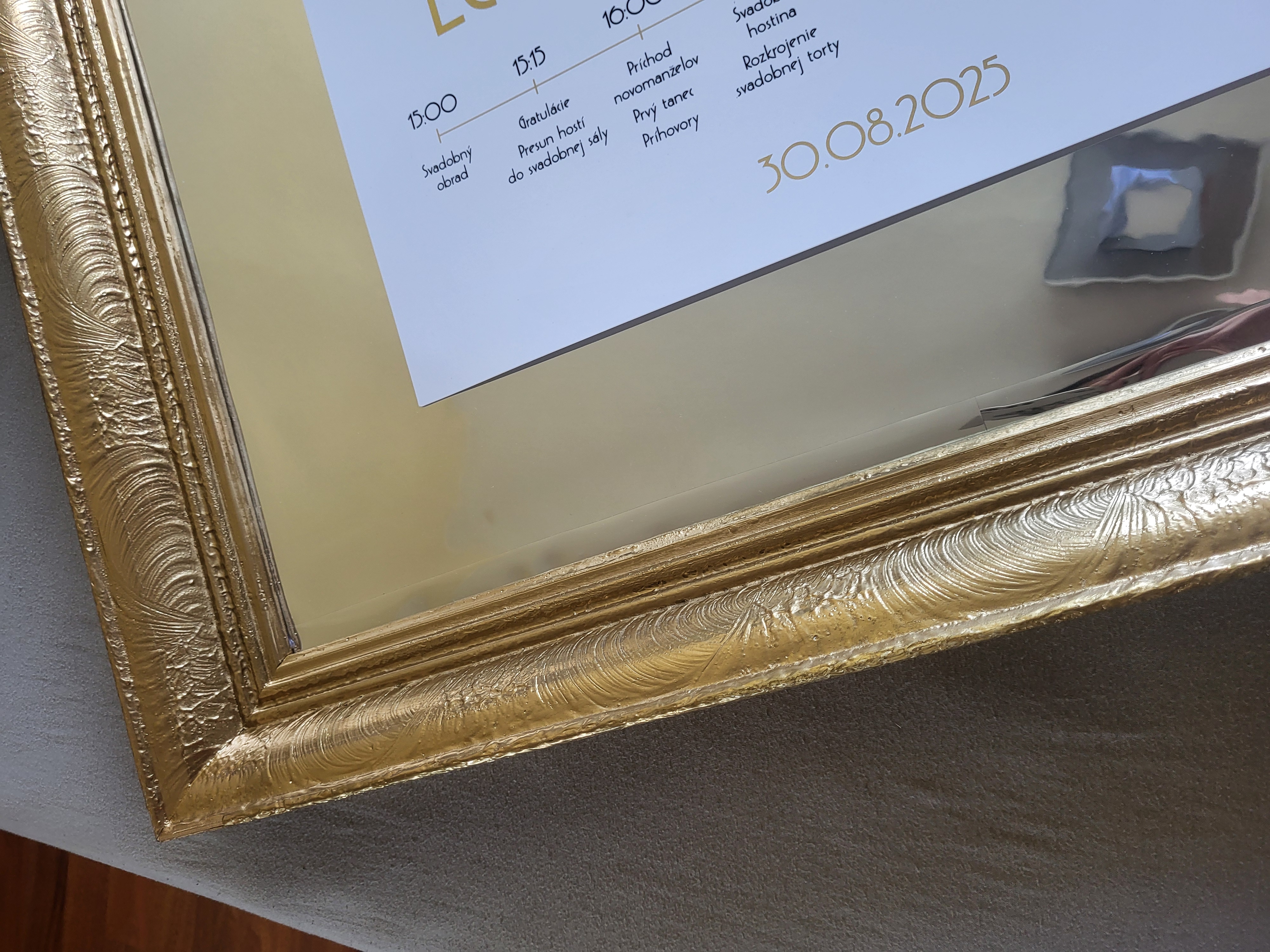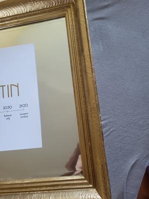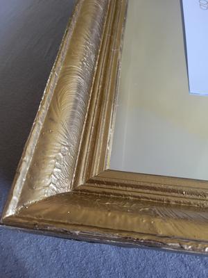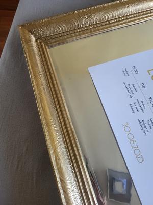 Ide o starý rám, ktorý mal už svoje nedostatky, obité rohy a podobne. Rám bol vyčistený, prebrúsený a prestriekaný zlatým chromovým sprejom. Rozmer papiera na fotke je A3.