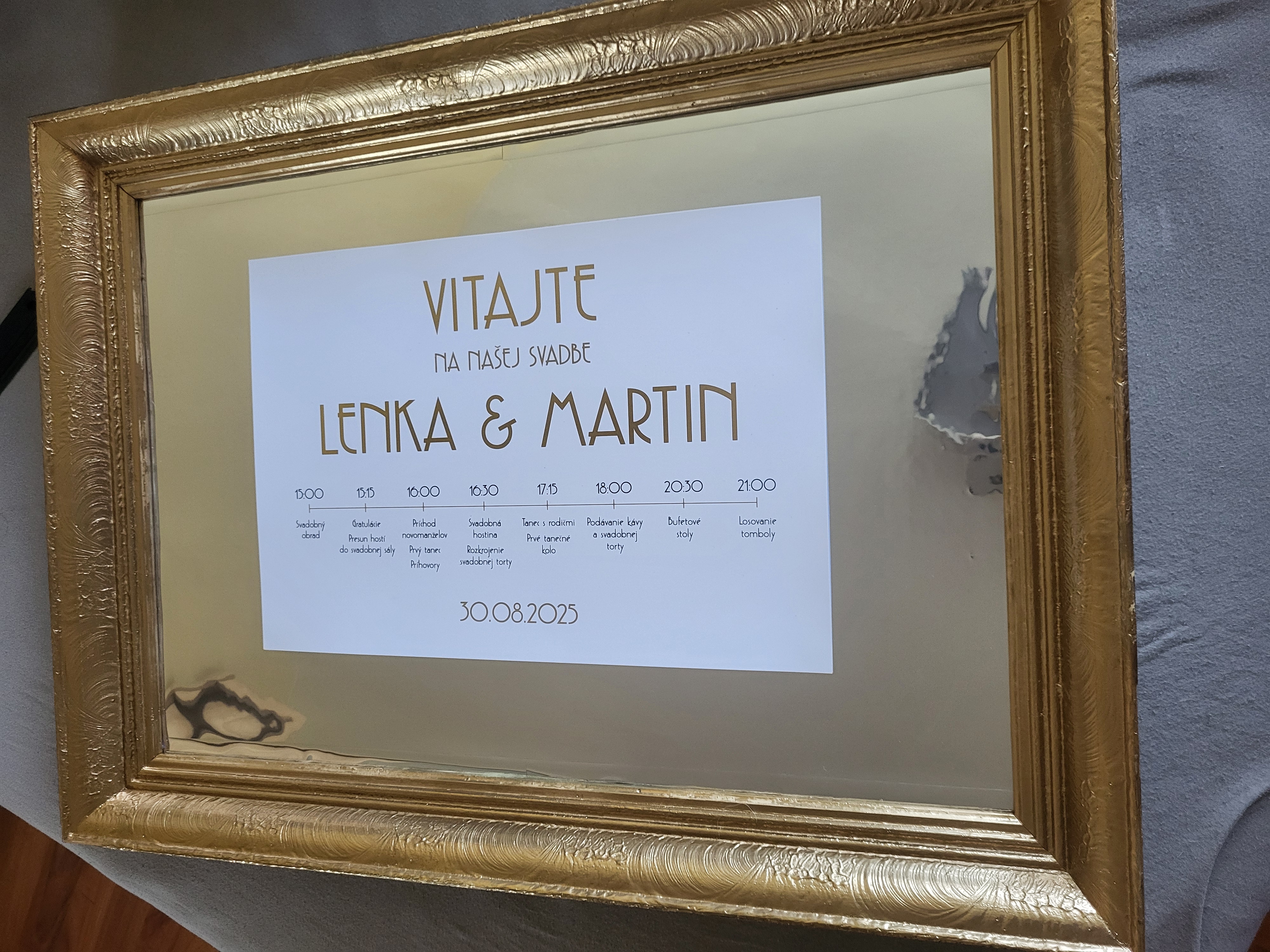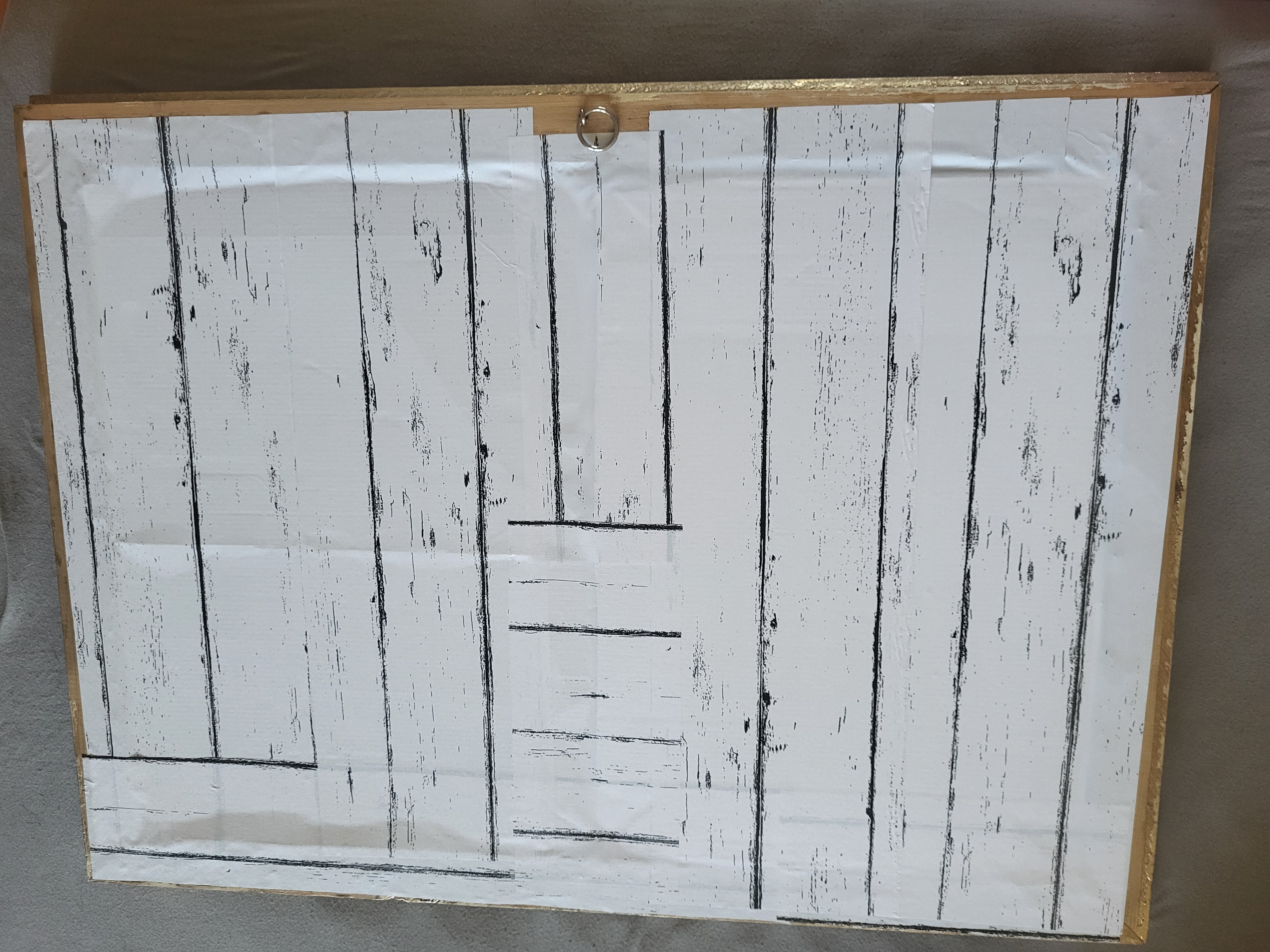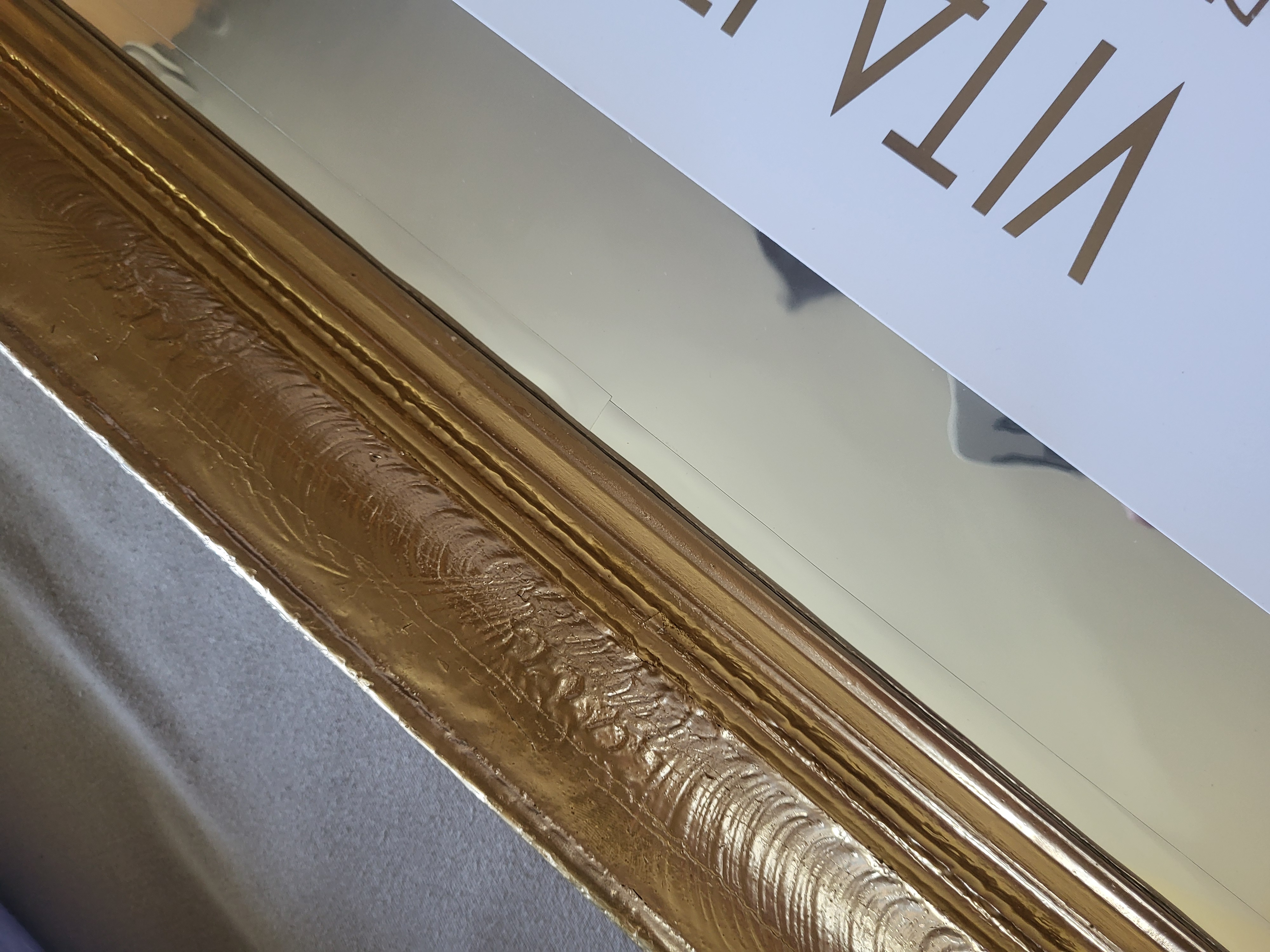 Ide o starý rám, ktorý mal už svoje nedostatky, obité rohy a podobne. Rám bol vyčistený, prebrúsený a prestriekaný zlatým chromovým sprejom. Rozmer papiera na fotke je A3.